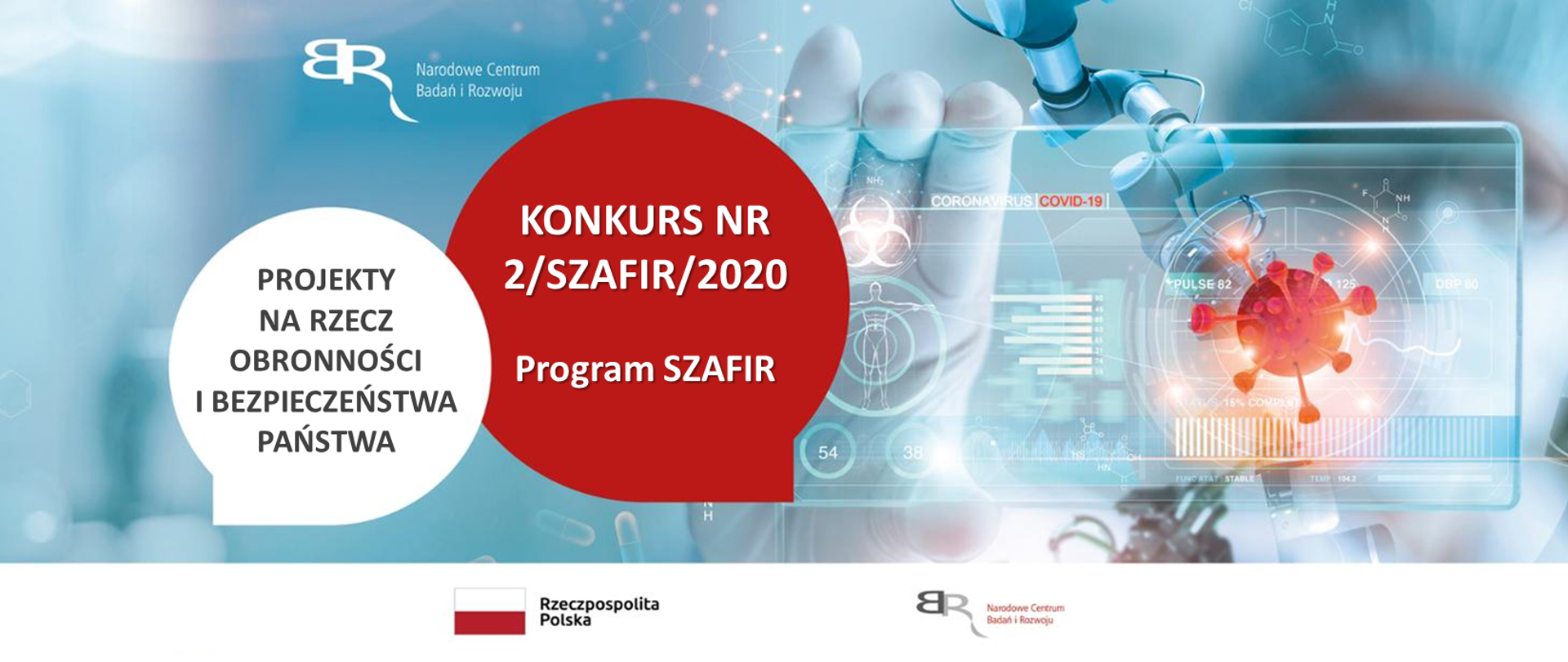 27.01.2021Konkursy z zakresu obronności i bezpieczeństwa państwa służące walce z epidemiąOd 21 września do 23 października 2020 r., NCBR przyjmowało wnioski w konkursie nr 2/SZAFIR/2020 na wykonanie i finansowanie projektów w zakresie badań naukowych lub prac rozwojowych na rzecz obronności i bezpieczeństwa państwa w ramach programu pn. „Rozwój nowoczesnych, przełomowych technologii służących bezpieczeństwu i obronności państwa” pod kryptonimem „SZAFIR”.