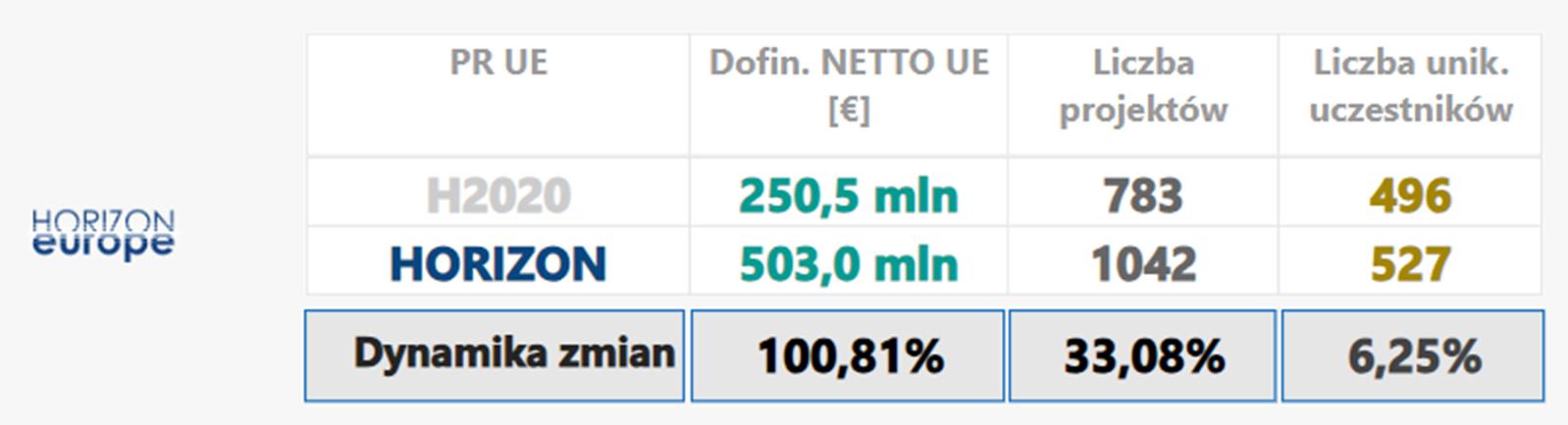 Przekroczona została kolejna granica zaangażowania polskich podmiotów w program ramowy Horyzont Europa (w tabeli poniżej oznaczony jako HORIZON). We wszystkich obszarach programu po pierwszych 440 konkursach polskim beneficjentom przyznano dotychczas 503 mln euro na realizację 1 042 projektów. To 100-procentowy wzrost wartości dofinansowania netto w porównaniu z analogicznym okresem Horyzontu 2020 (250,5 mln euro) oraz wzrost liczby realizowanych projektów z polskim udziałem o 33% (783 projekty w H2020). Przekłada się to również na znaczny wzrost średniego dofinansowania na projekt – z 320 tys. euro w H2020 do 483 tys. euro w Horyzoncie Europa.
