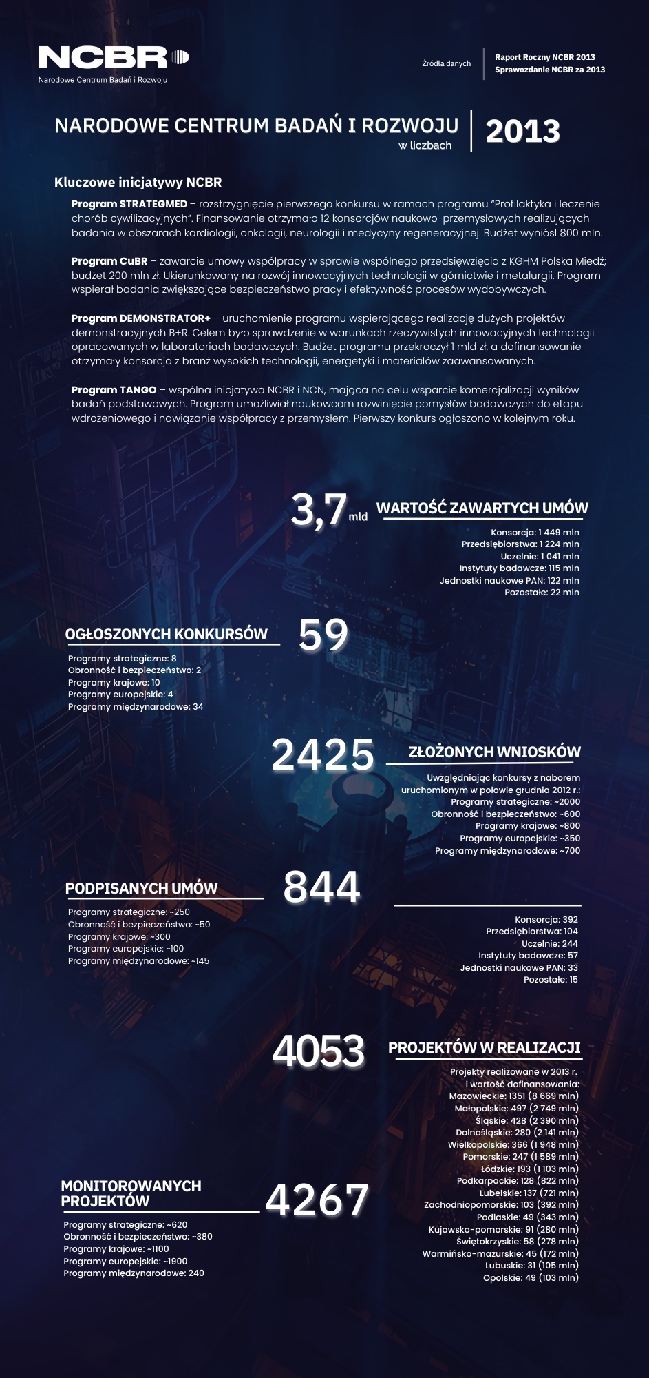 Infografika przedstawia działania centrum w 2013 roku. Liczbę ogłoszonych konkursów, złożonych wniosków, wartość zawartych umów oraz wartość dofinansowania projektów realizowanych w poszczególnych województwach.