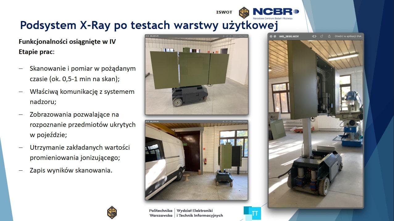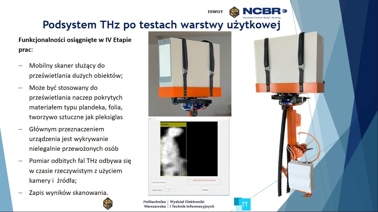 Opracowano i wykonano system wykrywania osób ukrytych w środkach transportu. Opracowano dokumentację techniczno-technologicznej. Zainstalowano i zwalidowano system w warunkach rzeczywistych oraz oceniono systemu w celu potwierdzenia spełnienia wymagań. Opracowano dokumentację eksploatacyjną, szkoleniową oraz przeprowadzono szkolenia w celu podnoszenia i weryfikacji kompetencji operatorów w sposób usystematyzowany w oparciu o strategię pozyskiwania i współdzielenia wiedzy operacyjnej z prowadzonych akcji w terenie. Wytworzono symulator - trenażer do prowadzenia szkoleń operatorów. Wzmocnienie funkcjonalności podzespołów systemu poprzez implementację elementów wspierających kontrolę i bezpieczeństwo takich jak: zaimplementowanie nowej technologii pozwalającej na identyfikację szerokiego spektrum związków m. in. materiałów wybuchowych oraz narkotyków oraz opracowano system stabilizacji położenia dla przenośnego stanowiska obrazowania terahercowego wraz z opracowaniem interfejsu komunikacyjnego.