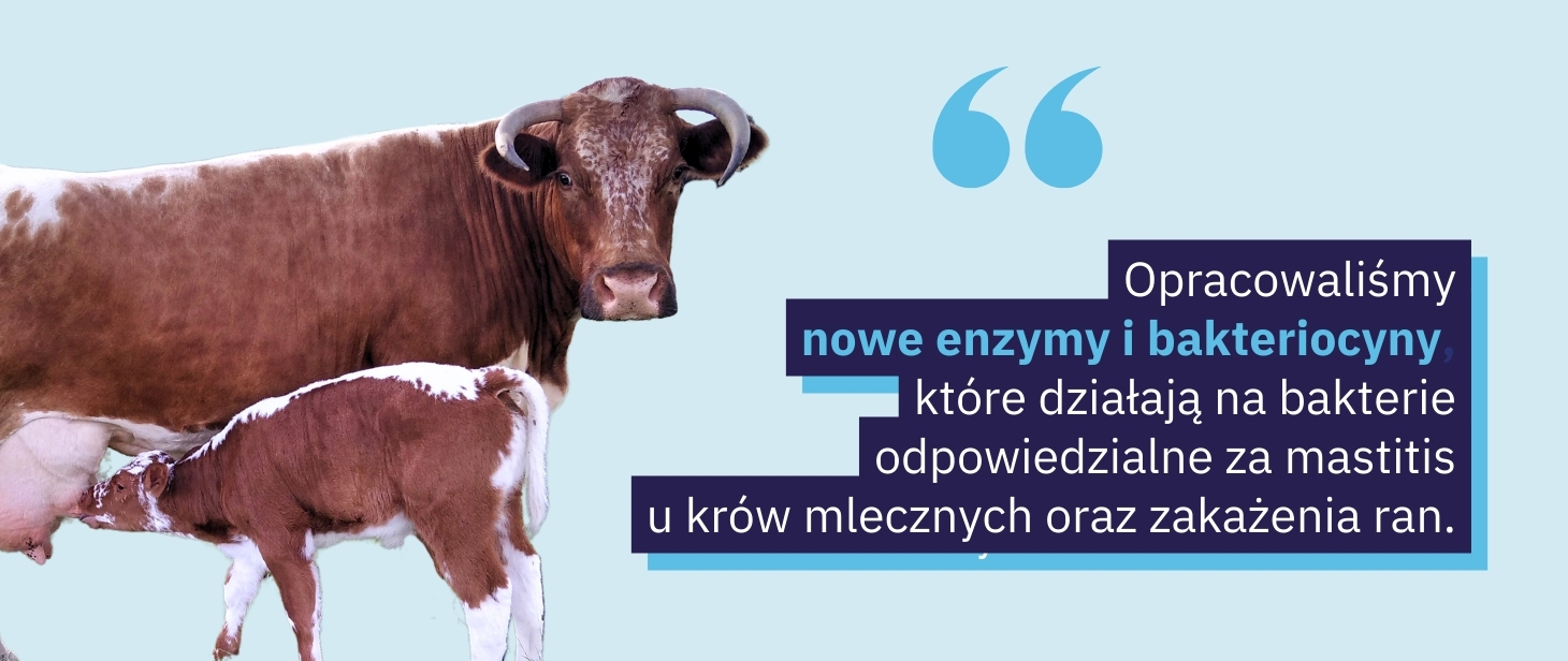 – Opracowaliśmy nowe enzymy i bakteriocyny, które działają na bakterie odpowiedzialne za mastitis u krów mlecznych oraz zakażenia ran. Zbadaliśmy ich działanie i opracowaliśmy metody produkcji. Przetestowaliśmy te substancje w laboratoriach – najpierw in vitro, a następnie na modelach zwierzęcych. Stworzyliśmy wstępne wersje produktów antybakteryjnych do higieny okołoudojowej. Potwierdziliśmy, że są skuteczne w testach polowych. Zbadaliśmy także, jak selektywne usuwanie szkodliwych bakterii wpływa na mikrobiotę – wylicza kierowniczka projektu. – Te wyniki napawają nas optymizmem.