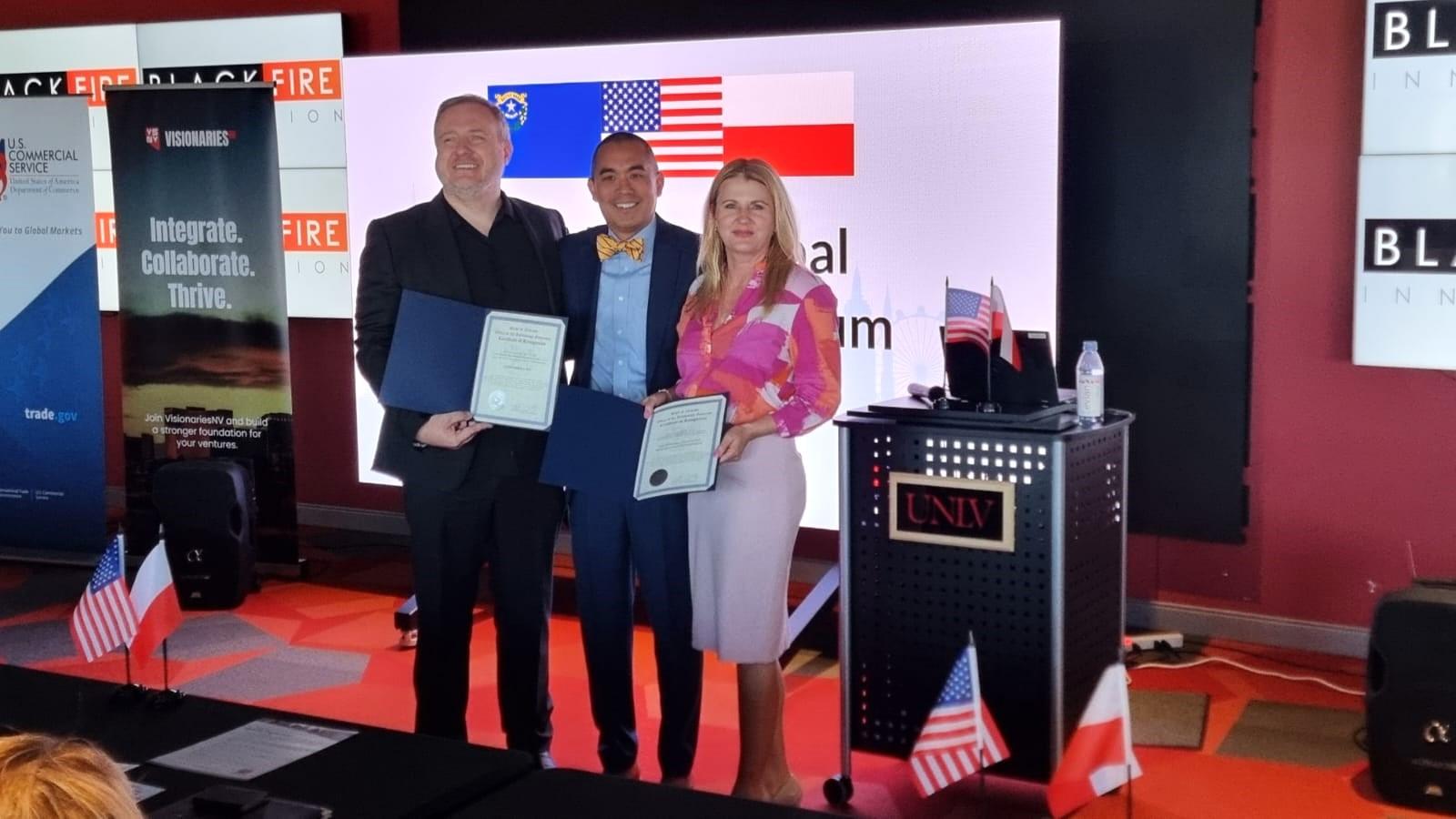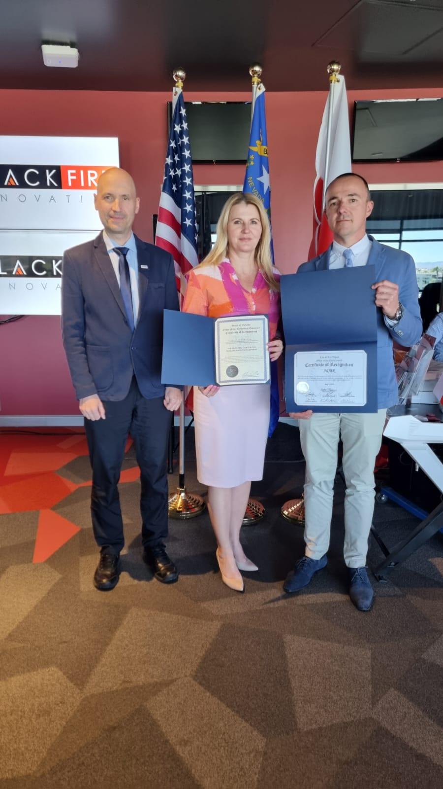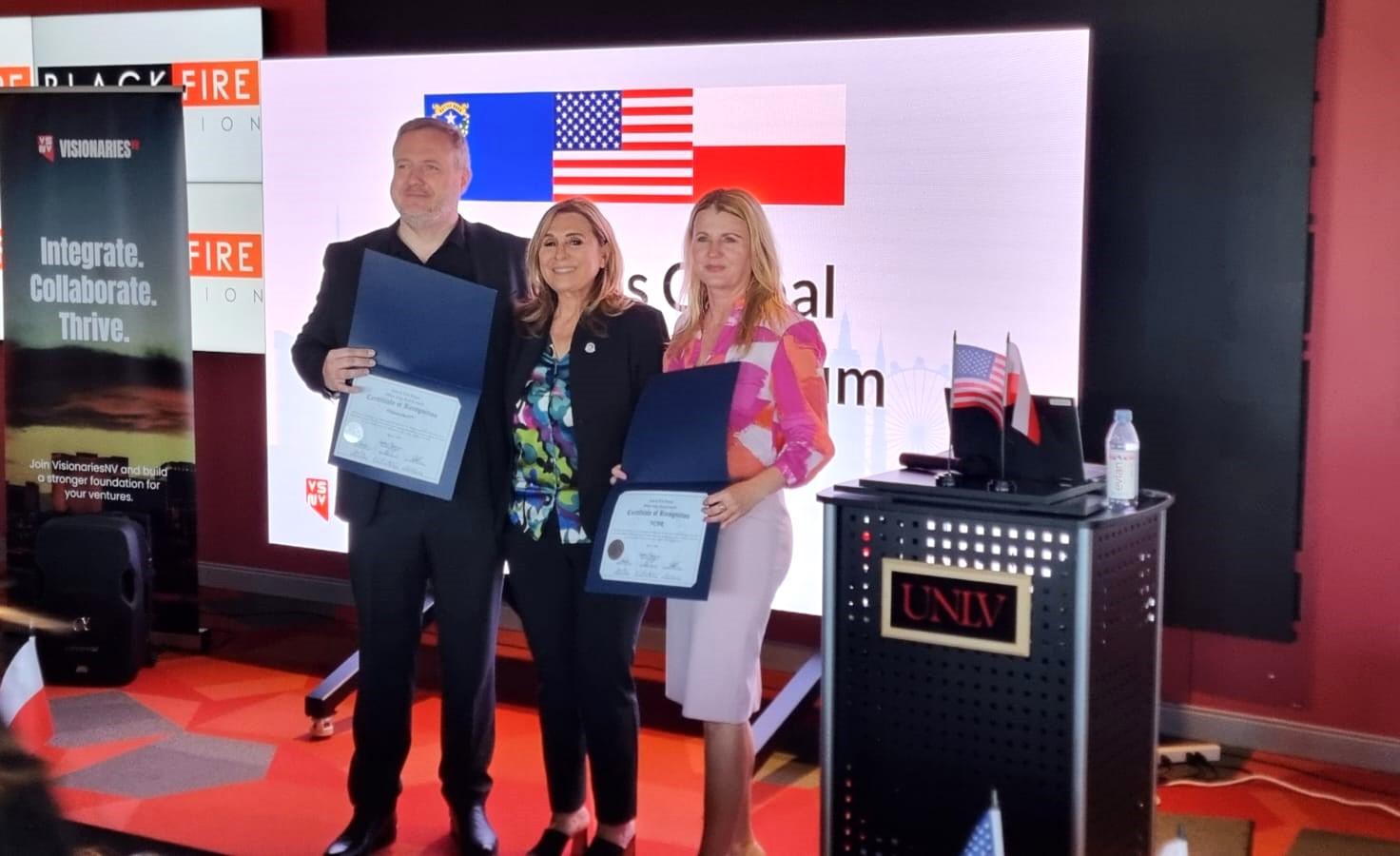 a Nevadą. Przyznali je wicegubernator Stanu Nevada oraz Burmistrz i Rada Miasta Las Vegas, a uroczyste wręczenie ich dyrektor Agnieszce Ratajczak nastąpiło podczas Las Vegas Global Acceleration Forum, w obecności przedstawicieli miejscowych senatorów i kongresmenów oraz po wysłuchaniu wykonanych na żywo hymnów Polski oraz USA. Tak udany efekt kilkuletnich już działań NCBR na rzecz zbliżania ekosystemów innowacji Polski i Nevady bardzo dobrze rokuje na dalszą współpracę w tym zakresie.