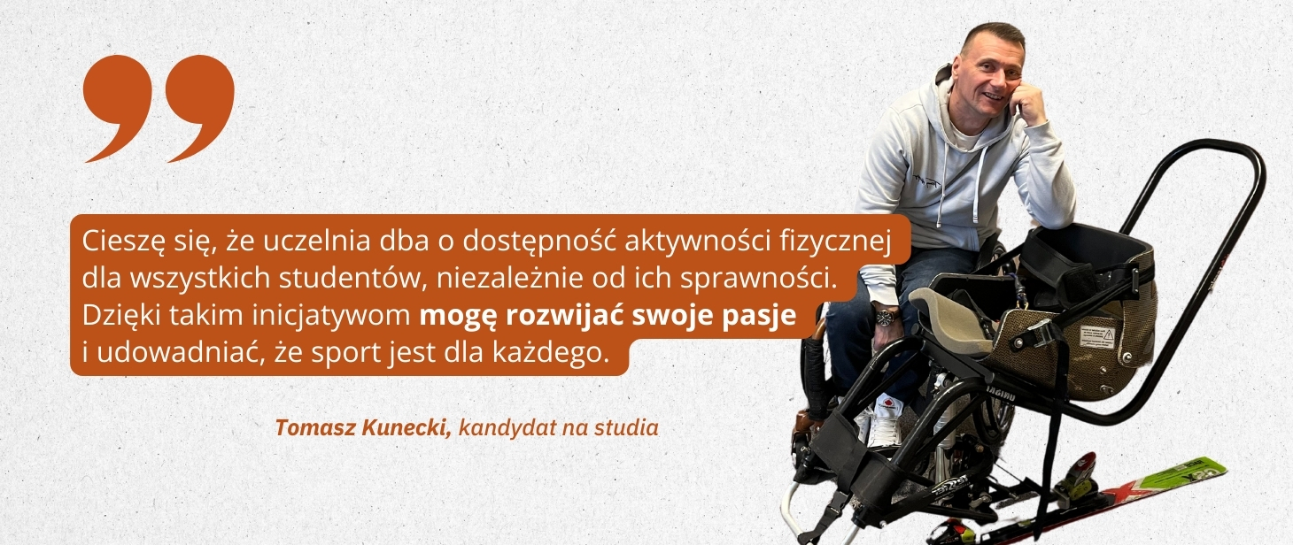 – Planuję podjęcie studiów na Politechnice Opolskiej, ponieważ ogromne znaczenie ma dla mnie dostępność sportu i rekreacji. Otwarcie Centrum Adaptowanej Aktywności Fizycznej to dla mnie szansa na aktywne życie i rozwój pasji sportowych. Szczególnie cieszy mnie oferta żeglowania inkluzywnego, narciarstwa na dual ski oraz jazdy na rowerze w terenie, które pozwalają przełamywać bariery i czerpać radość z ruchu. Możliwość korzystania z profesjonalnego wsparcia wykwalifikowanego personelu daje poczucie bezpieczeństwa i motywuje do podejmowania nowych wyzwań. Sport to dla mnie nie tylko forma rehabilitacji, ale także sposób na integrację i budowanie pewności siebie. Studia na Politechnice Opolskiej to dla mnie zarówno edukacja, jak i pełniejszy udział w życiu akademickim oraz społecznym. Cieszę się, że uczelnia dba o dostępność aktywności fizycznej dla wszystkich studentów, niezależnie od ich sprawności. Dzięki takim inicjatywom mogę rozwijać swoje pasje i udowadniać, że sport jest dla każdego – mówi Tomasz Kunecki, kandydat na studia.