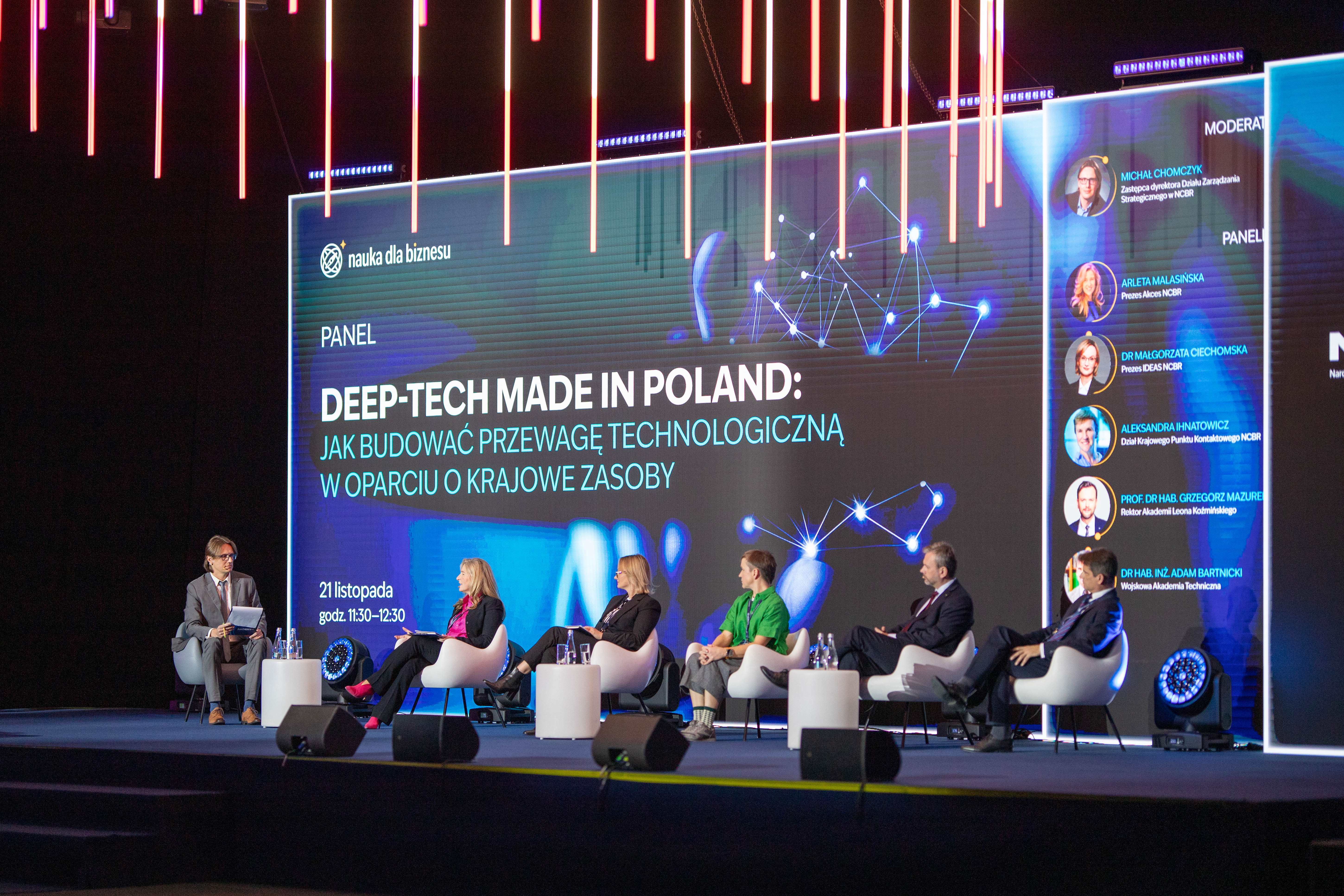 Ostatniego dnia wydarzenia, pod patronatem NCBR odbył się panel dyskusyjny „Deep-tech made in Poland: jak budować przewagę technologiczną w oparciu o krajowe zasoby?”, prowadzony przez Michała Chomczyka, zastępcę dyrektora Działu Zarządzania Strategicznego w NCBR. Razem z przedstawicielkami Grupy NCBR – prezes Akces NCBR Arletą Malasińską, prezes IDEAS NCBR dr Małgorzatą Ciechomską, Aleksandrą Ihnatowicz, koordynatorką w Dziale Krajowego Punktu Kontaktowego NCBR oraz przedstawicielami środowiska naukowego – rektorem Akademii Leona Koźmińskiego prof. dr hab. Grzegorzem Mazurkiem oraz dyrektorem Centrum Transferu Technologii Wojskowej Akademii Technicznej dr hab. inż. Adamem Bartnickim rozmawiano o tym, jak skutecznie tworzyć technologie deep tech i jak korzystać w tym celu ze wsparcia państwa.