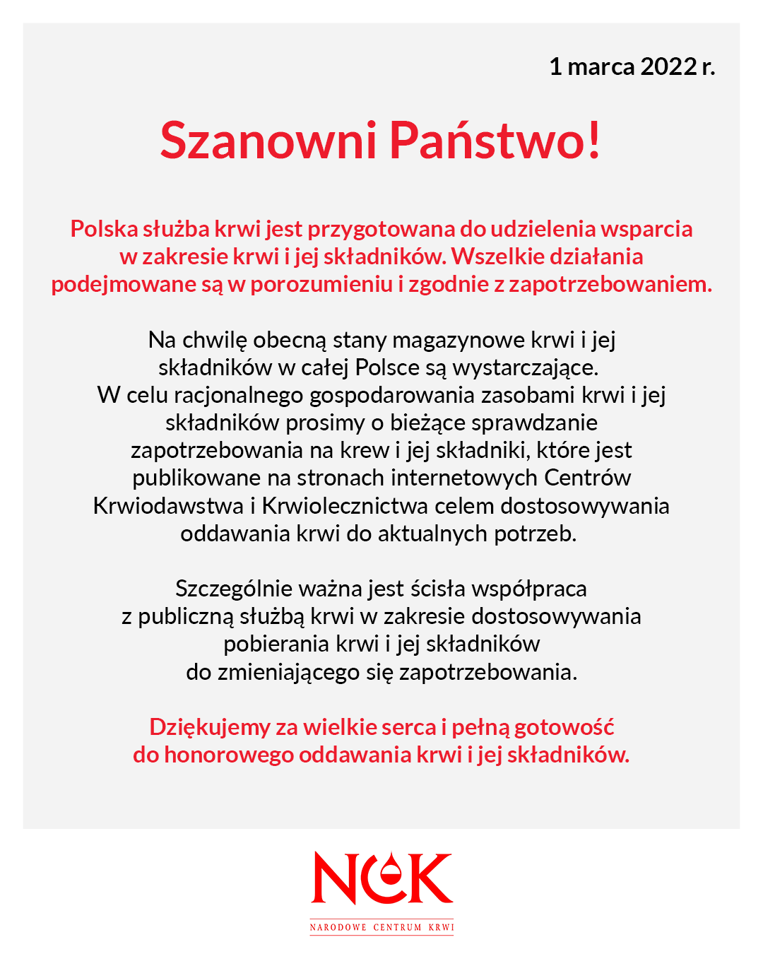 Na chwilę obecną stany magazynowe krwi i jej składników w całej Polsce są wystarczające. W celu racjonalnego gospodarowania zasobami krwi prosimy o bieżące sprawdzanie zapotrzebowania na krew i jej składniki, które jest publikowane na stronach internetowych Centrów Krwiodawstwa i Krwiolecznictwa celem dostosowywania oddawania krwi do aktualnych potrzeb.