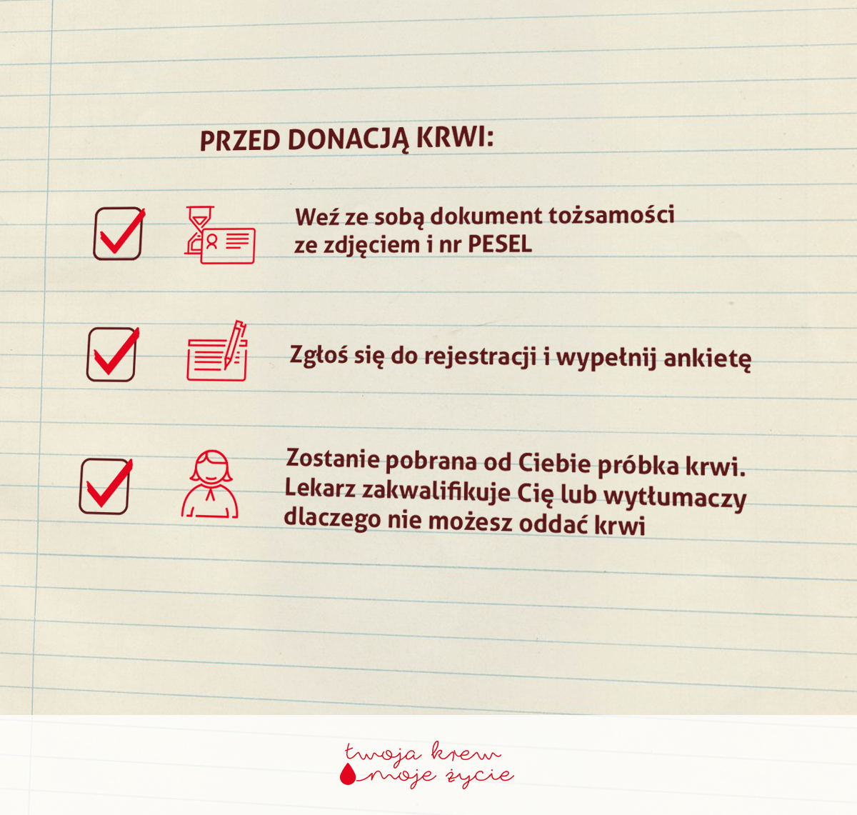 W dniu oddania krwi należy być wyspanym i wypoczętym oraz zdrowym, czyli: