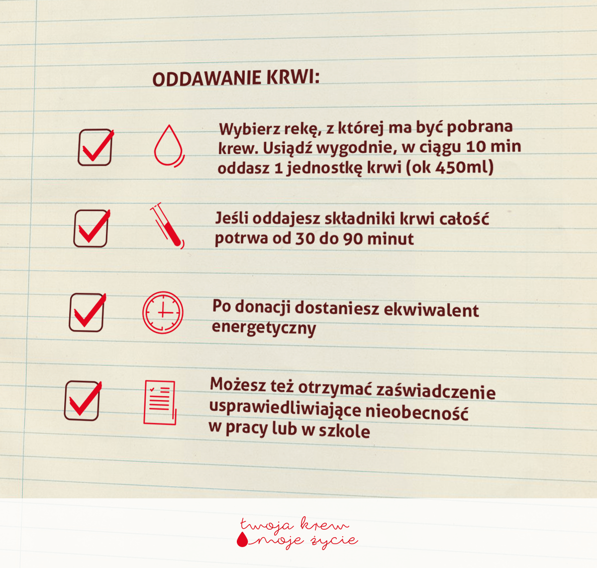 - jeśli potrzebujesz – skorzystaj z dni wolnych, które przysługują Ci po oddaniu krwi,