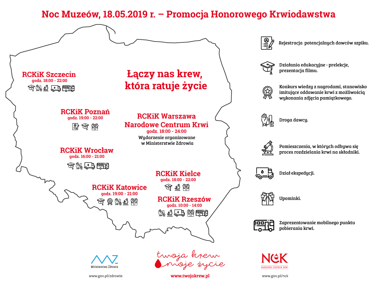 18 maja odbędzie się Noc Muzeów, w której wezmą udział Regionalne Centra Krwiodawstwa i Krwiolecznictwa w: Katowicach, Kielcach, Poznaniu, Rzeszowie, Szczecinie, we Wrocławiu. Podczas zwiedzania RCKiK odbędą się specjalnie przygotowane akcje promujące honorowe krwiodawstwo.