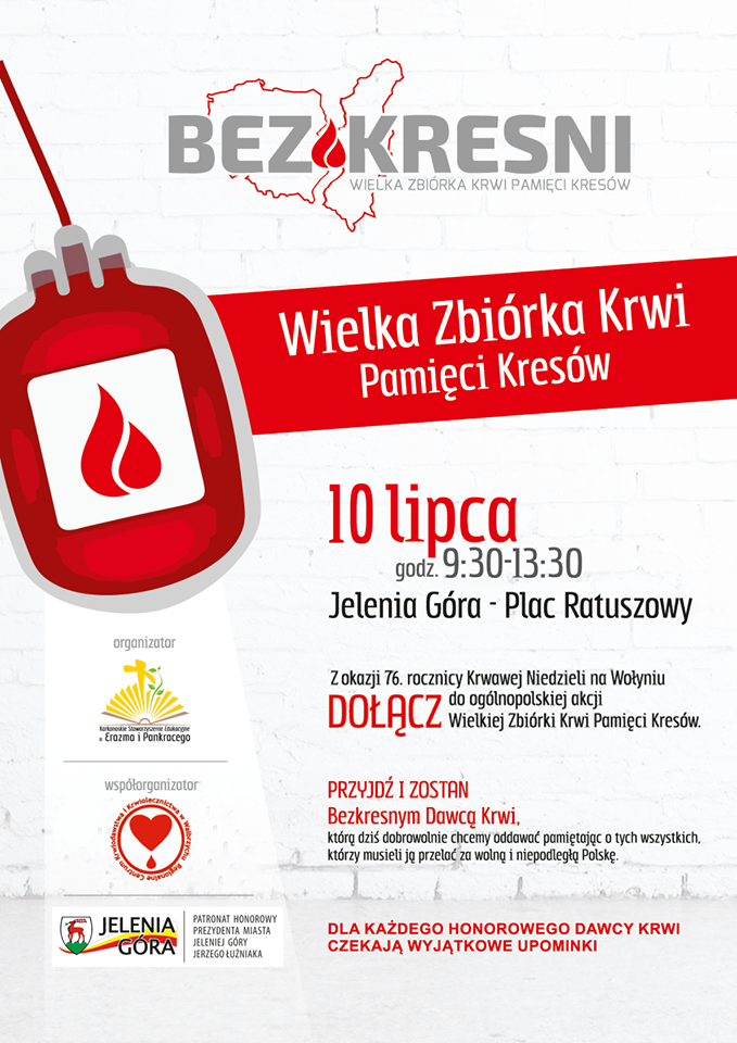 Z okazji 76 rocznicy Krwawej Niedzieli na Wołyniu pragniemy zaprosić na akcję pobierania krwi 10 lipca 2019 r. w Ambulansie na jeleniogórskim Rynku. Akcja zorganizowana została ku pamięci wszystkich, którzy przelali krew za niepodległą Polskę.