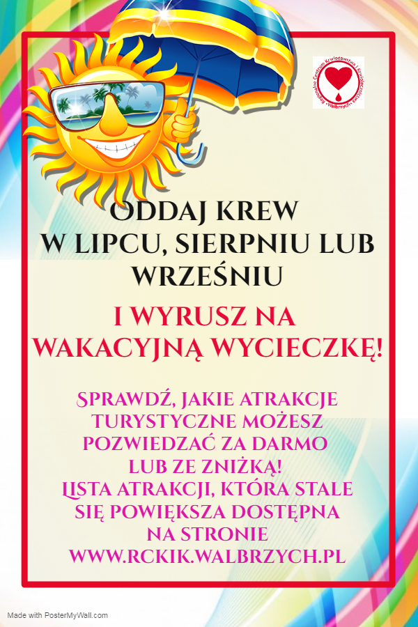 RCKiK w Wałbrzychu zaprasza do oddawania krwi szczególnie w okresie wakacyjnym. Każdy Krwiodawca, który odda krew w lipcu, sierpniu i wrześniu będzie mógł skorzystać z bezpłatnego lub promocyjnego wejścia na wiele atrakcji turystycznych na obszarze działania RCKiK w Wałbrzychu.