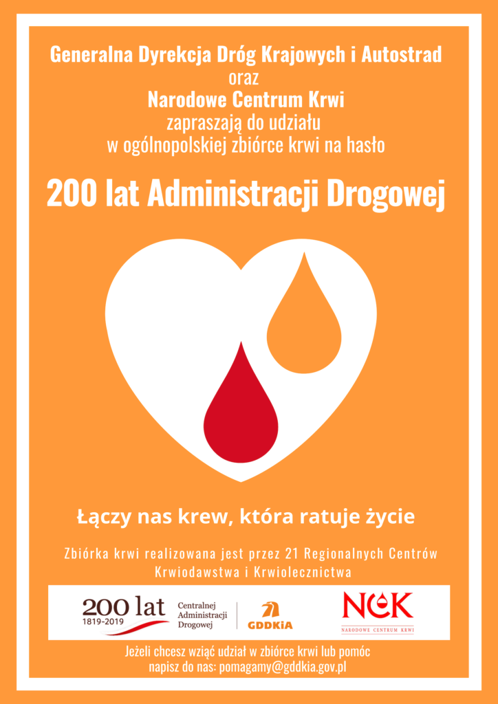 W związku z jubileuszem 200 lat istnienia Centralnej Administracji Drogowej pracownicy Generalnej Dyrekcji Dróg Krajowych i Autostrad postanowili uczcić rocznicę organizując akcję ogólnopolskiej zbiórki krwi. Do udziału w honorowym oddawaniu krwi zachęcamy również przedstawicieli administracji publicznej, innych administracji drogowych z zarządów dróg wojewódzkich i powiatowych, pracowników branży drogowej, oraz wszystkie osoby, którym bliska jest idea pomagania.