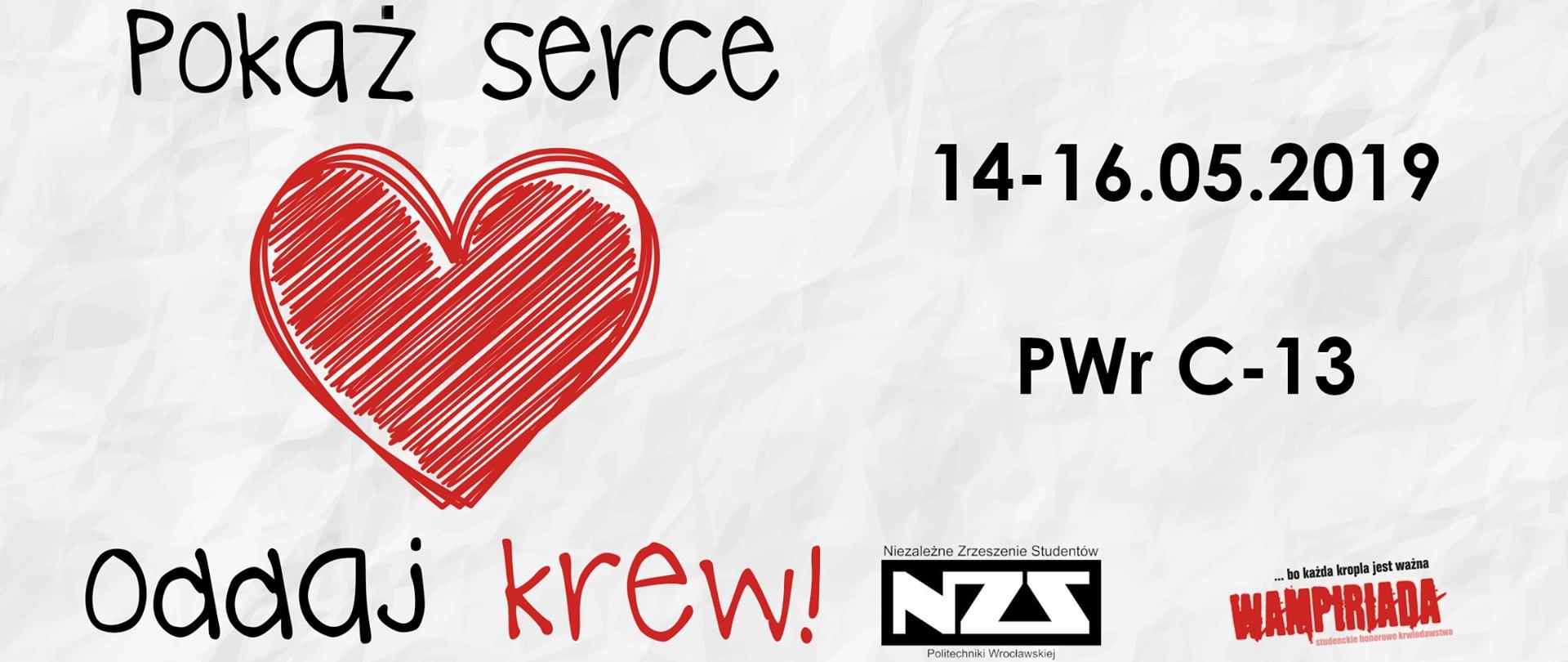 Niezależne Zrzeszenie Studentów Politechniki Wrocławskiej oraz Regionalne Centrum Krwiodawstwa i Krwiolecznictwa we Wrocławiu serdecznie zapraszają na studencką akcję honorowego krwiodawstwa - Wampiriada, która odbędzie się w dniach 14-16 maja 2019 r. w budynku C-13 Politechniki Wrocławskiej przy Wybrzeżu Wyspiańskiego 23-25. Akcja będzie przeprowadzona w godzinach 09:00 – 13.00.