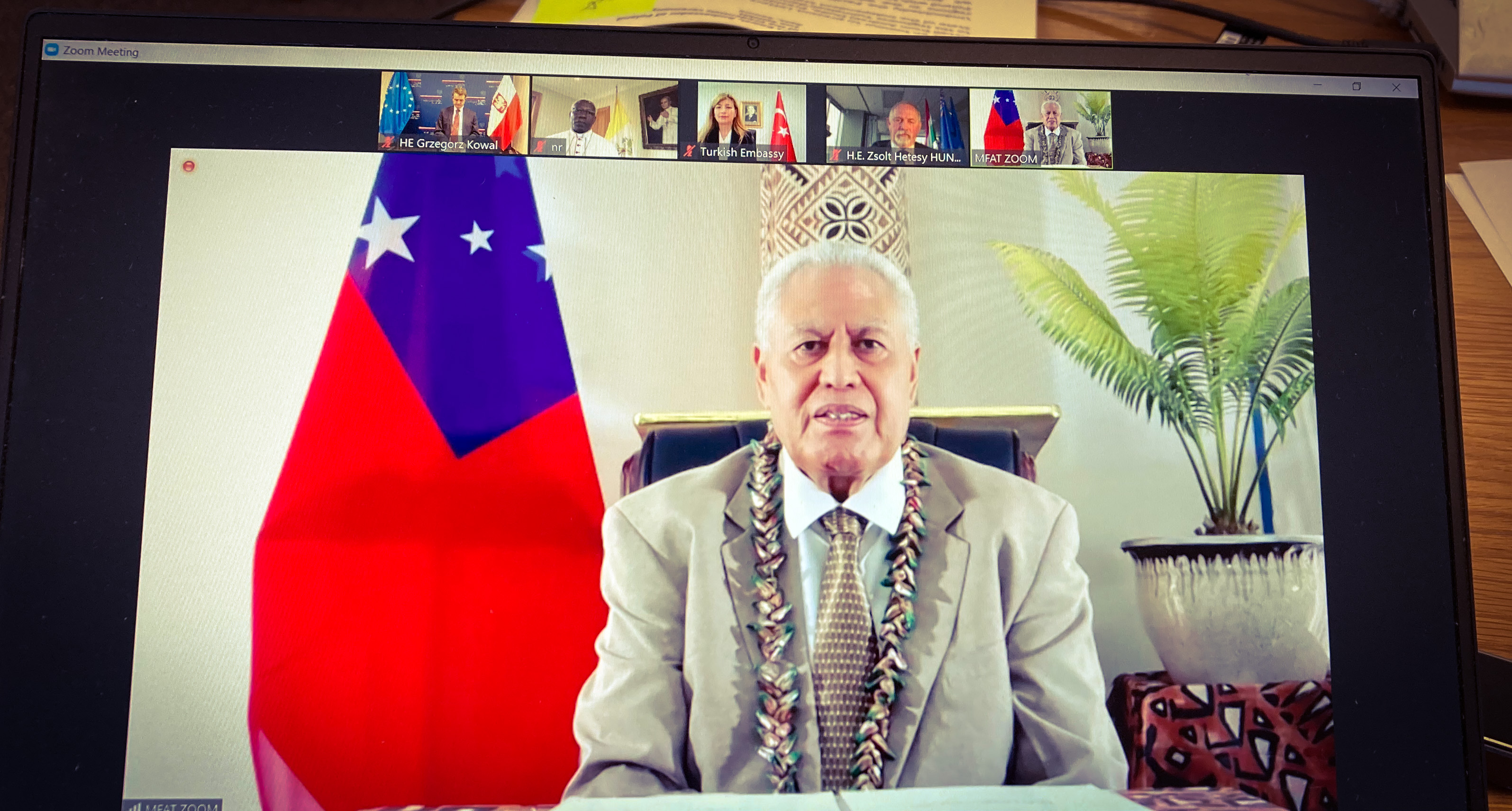 In his speech, Ambassador G. Kowal recalled that the establishment of diplomatic relations with Samoa took place 10 years ago in New York. He emphasized the foundations that bind both countries, which are democracy, respect for international law and human rights. A similar view on international affairs is also important. The Ambassador of the Republic of Poland thanked the Independent State of Samoa for its clear position condemning Russia's invasion of Ukraine. Briefly discussing contemporary cooperation, the Ambassador highlighted joint efforts to combat the effects of climate change at the UN forum (COP24 in Katowice, in which the Samoan delegation participated). He also assured of plans to pay a personal visit to Apia after the travel restrictions are lifted.