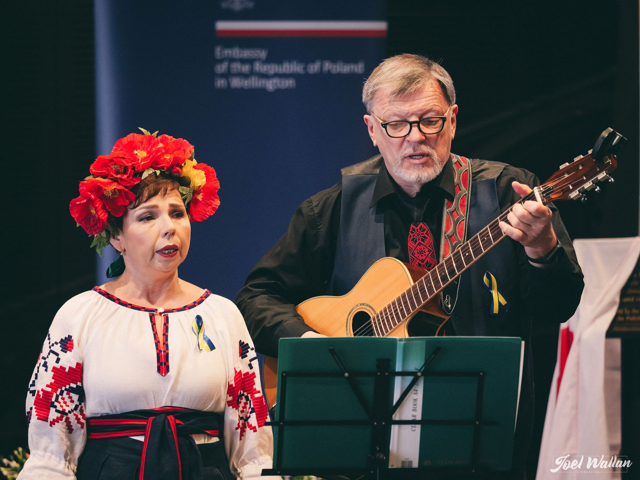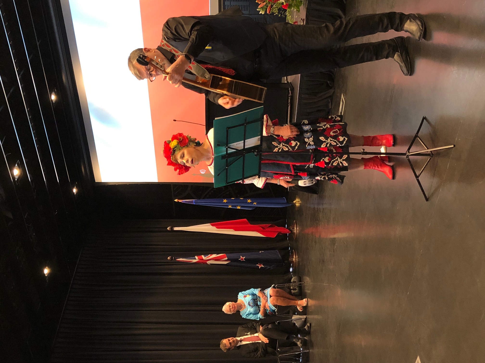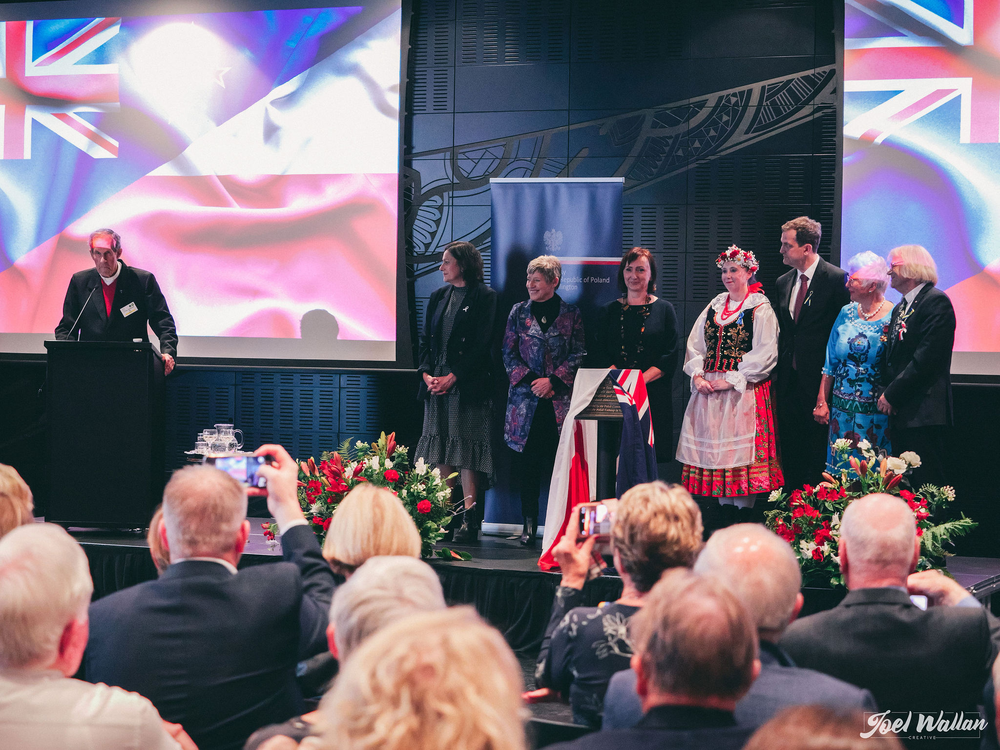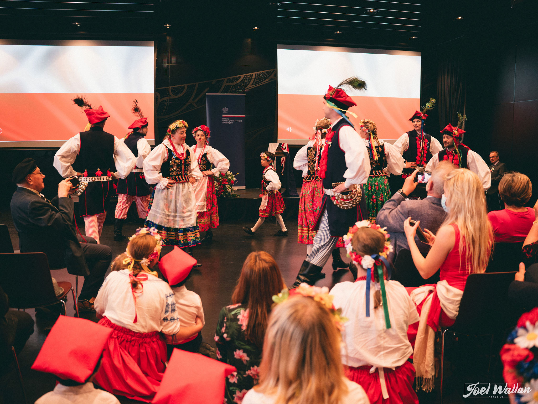 Special video messages were presented by Goveror-General of New Zealand Dame Cindy Kiro and Poland's Deputy Foreign Minister Szymon Szynkowski vel Sęk. CSO violinist of Polish origin Laura Barton performed Oginski's Polonaise. Polonus Dance Group and the Polish children performed Polish dances. A tribute to Ukraine was made by a minute of silence followed by a moving pefrormance by Ukrainian artists. Throughout the event an exhibition on first Polish settlers prepared by Between the Waters Foundation was displayed.