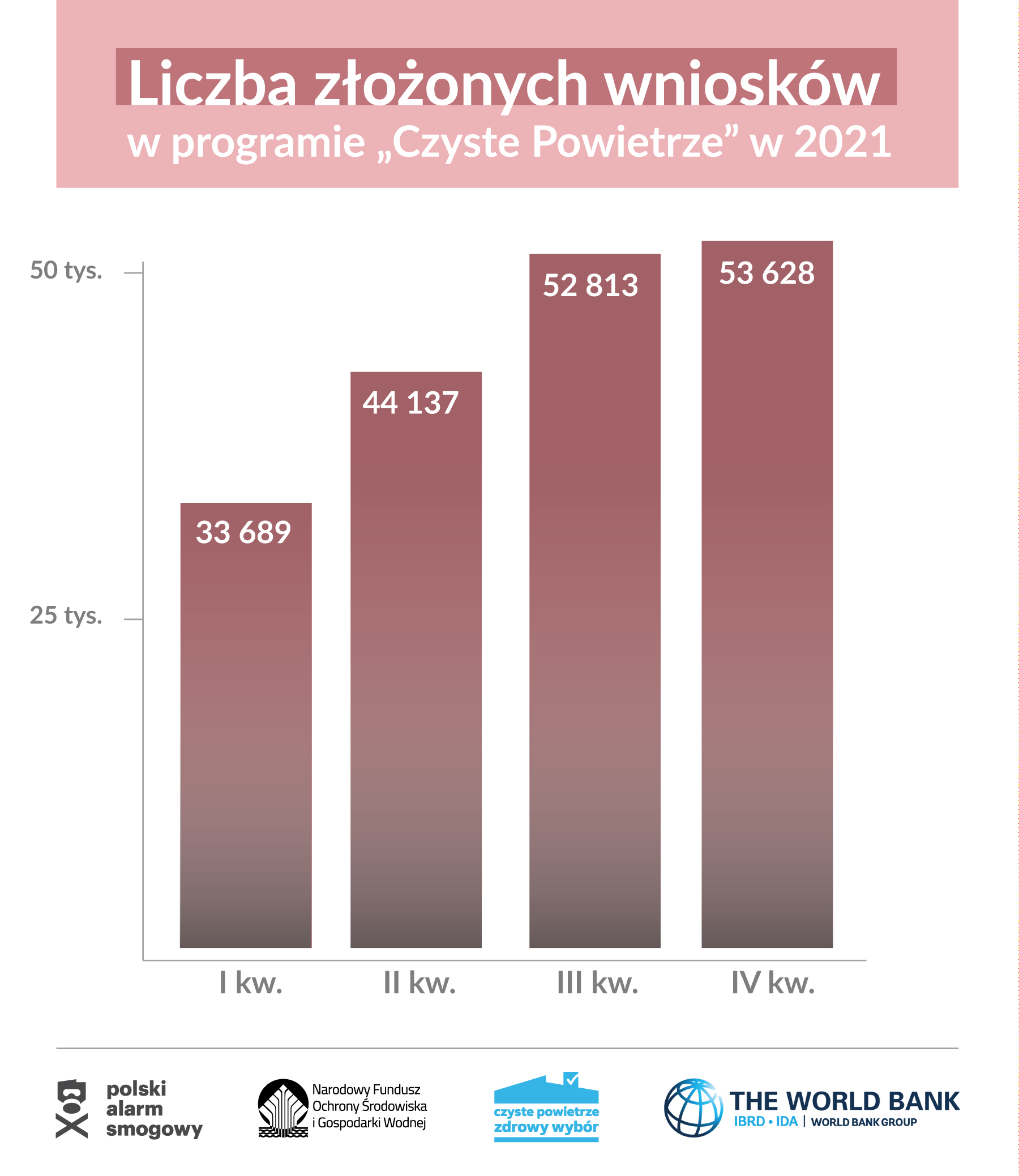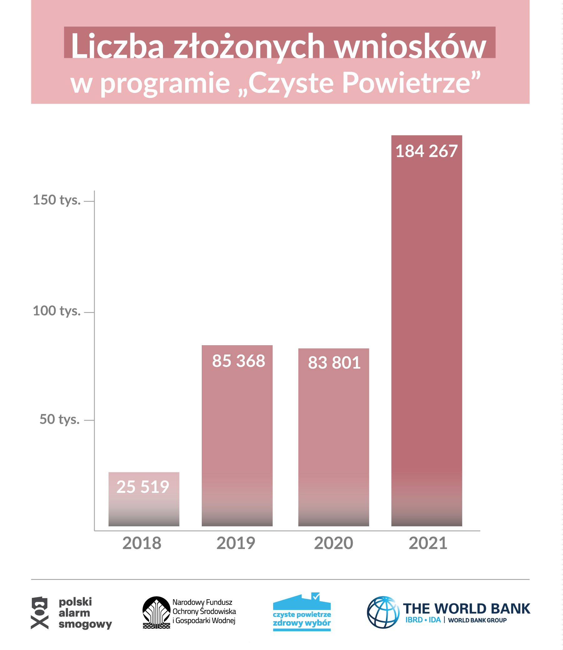 i 83 801 wniosków (2020). Rekordowy okazał się rok 2021, kiedy złożono ich aż 184 267, tj. 48,6% wszystkich złożonych wniosków w programie. W ciągu dziesięciu lat trwania programu przewidziana jest wymiana 3 milionów „kopciuchów” w całym kraju.