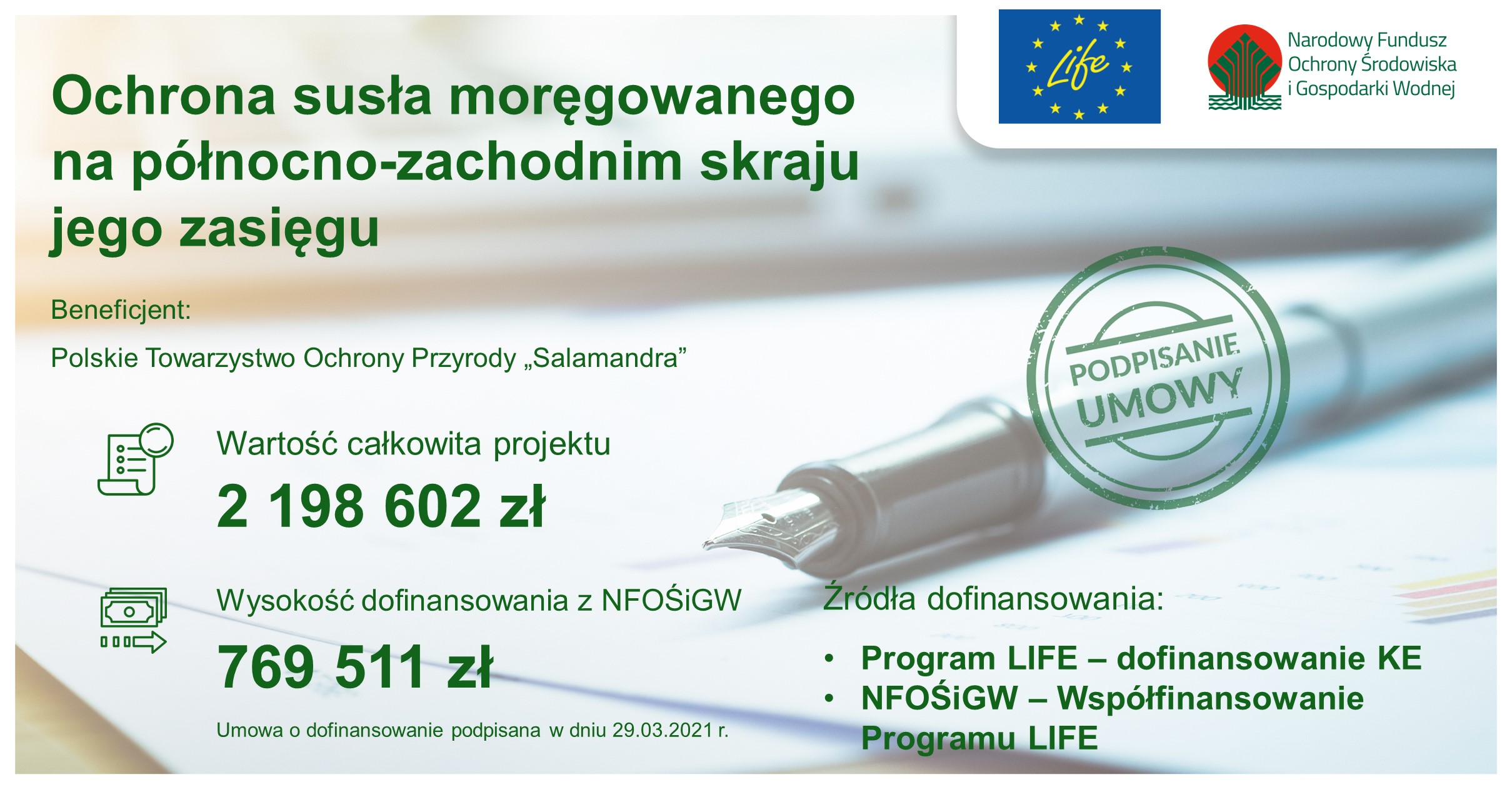 Polskie Towarzystwo Ochrony Przyrody „Salamandra” otrzymało ok. 770 tys. zł dotacji z Narodowego Funduszu Ochrony Środowiska i Gospodarki Wodnej na współfinansowanie projektu LIFE „Ochrony susła moręgowanego na północno-zachodnim skraju jego zasięgu”. Gatunek ten jest umieszczony w Dyrektywie Siedliskowej Unii Europejskiej – podstawie europejskiego systemu ochrony przyrody Natura 2000. Znajduje się także na Czerwonej Liście gatunków zagrożonych wyginięciem IUCN. Jako rodzimy ssak w Polsce, wymaga pilnych działań ratunkowych.
