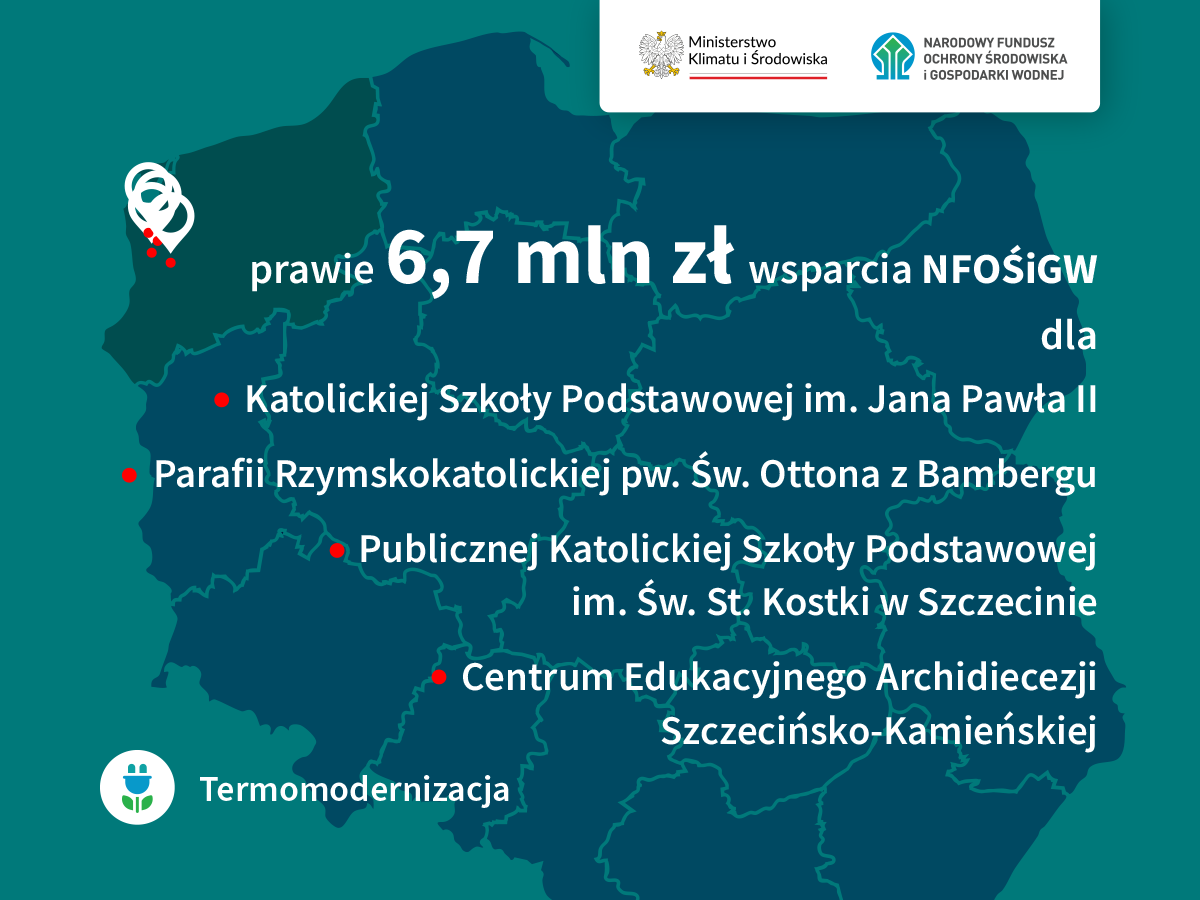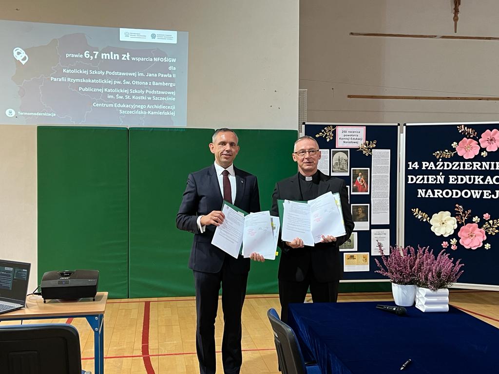 Narodowy Fundusz Ochrony Środowiska i Gospodarki Wodnej przekaże dofinansowanie na poprawę efektywności energetycznej budynków Katolickiej Szkoły Podstawowej im. Jana Pawła II, na termomodernizację budynku plebanii parafii pw. Św. Ottona z Bambergu oraz Publicznej Katolickiej Szkoły Podstawowej im. Św. Stanisława Kostki a także sali gimnastycznej przy Placu Ottona 1 w Szczecinie. Uroczyste podpisanie umów nastąpiło 13 października.