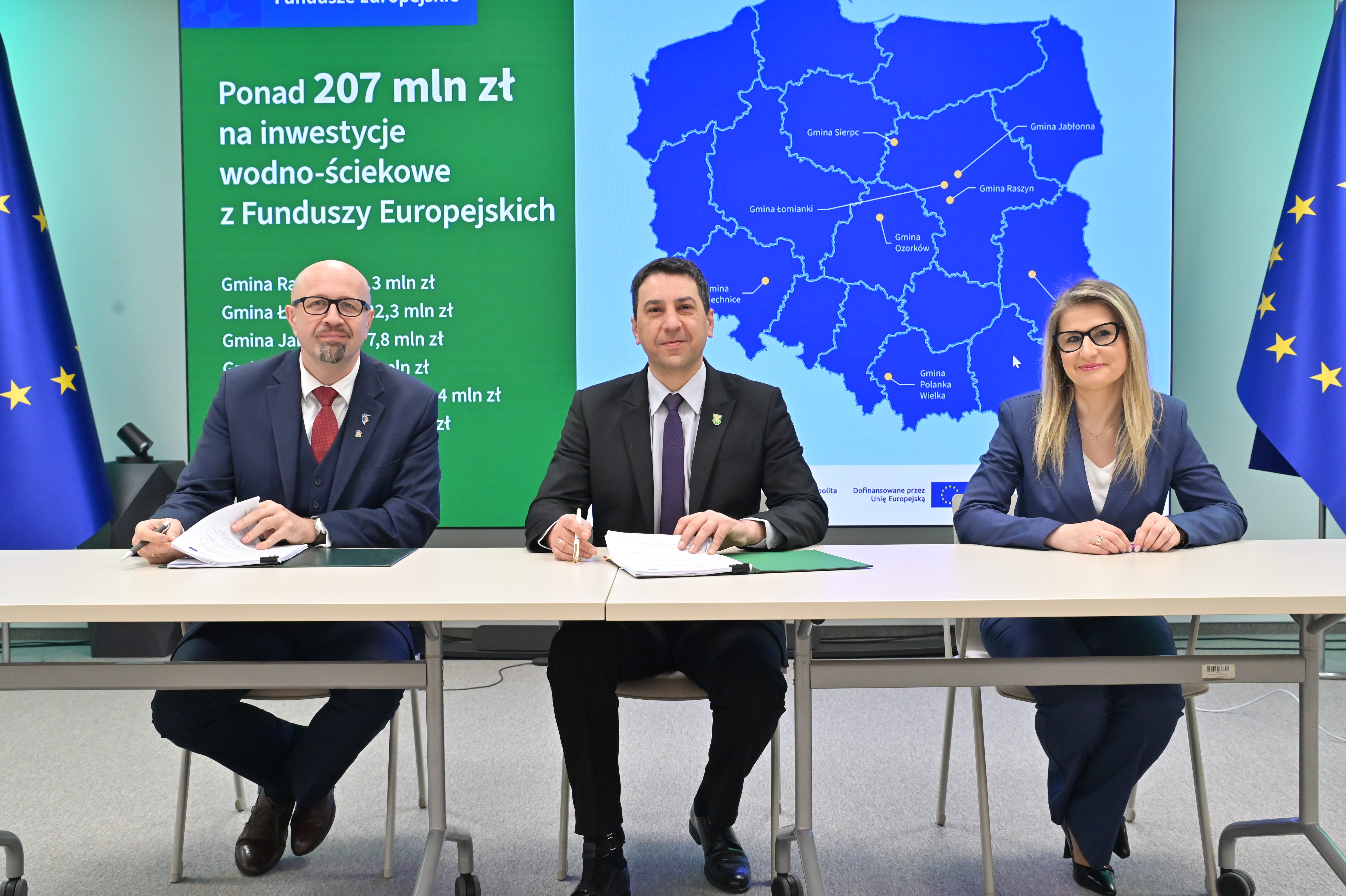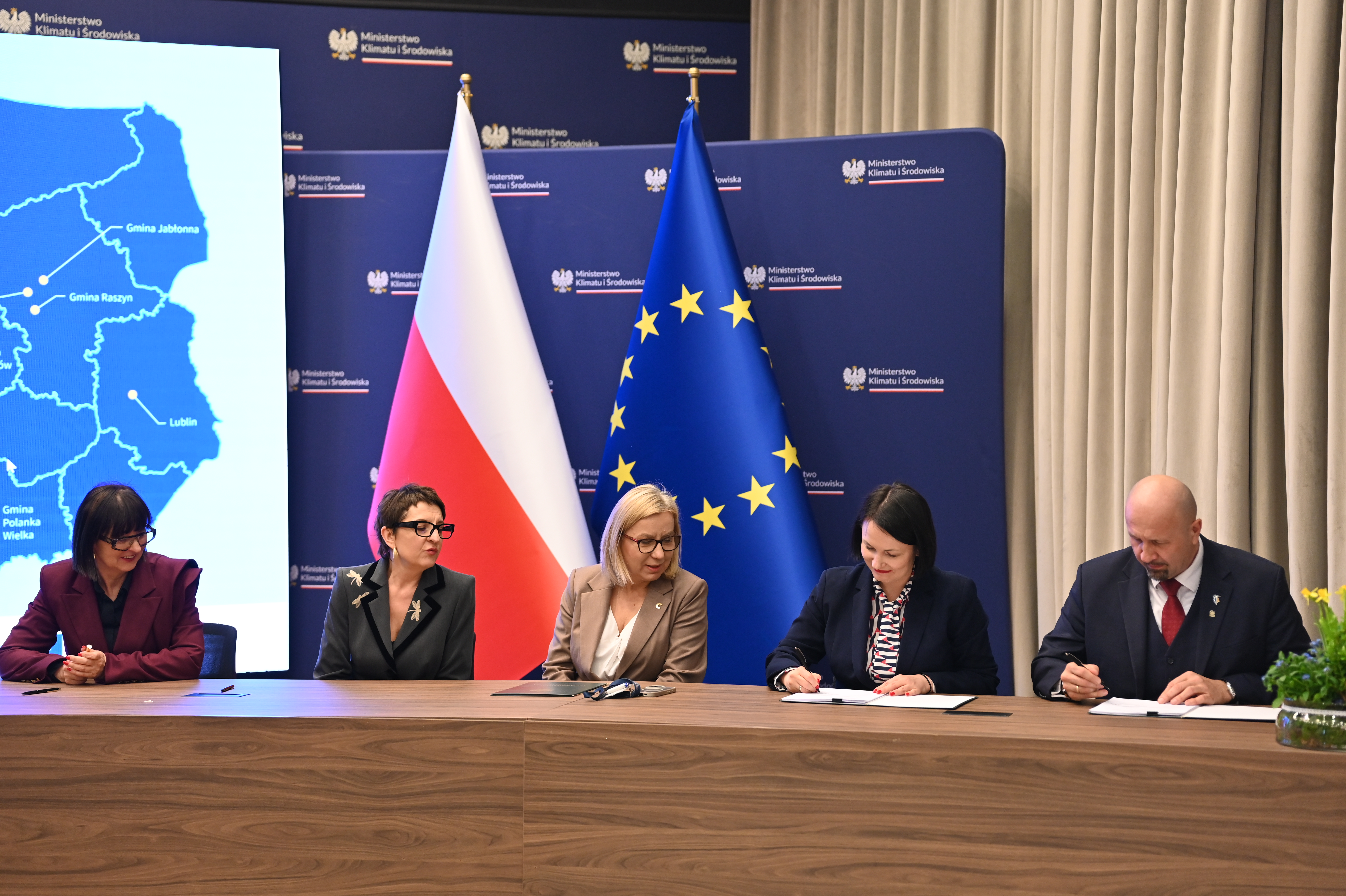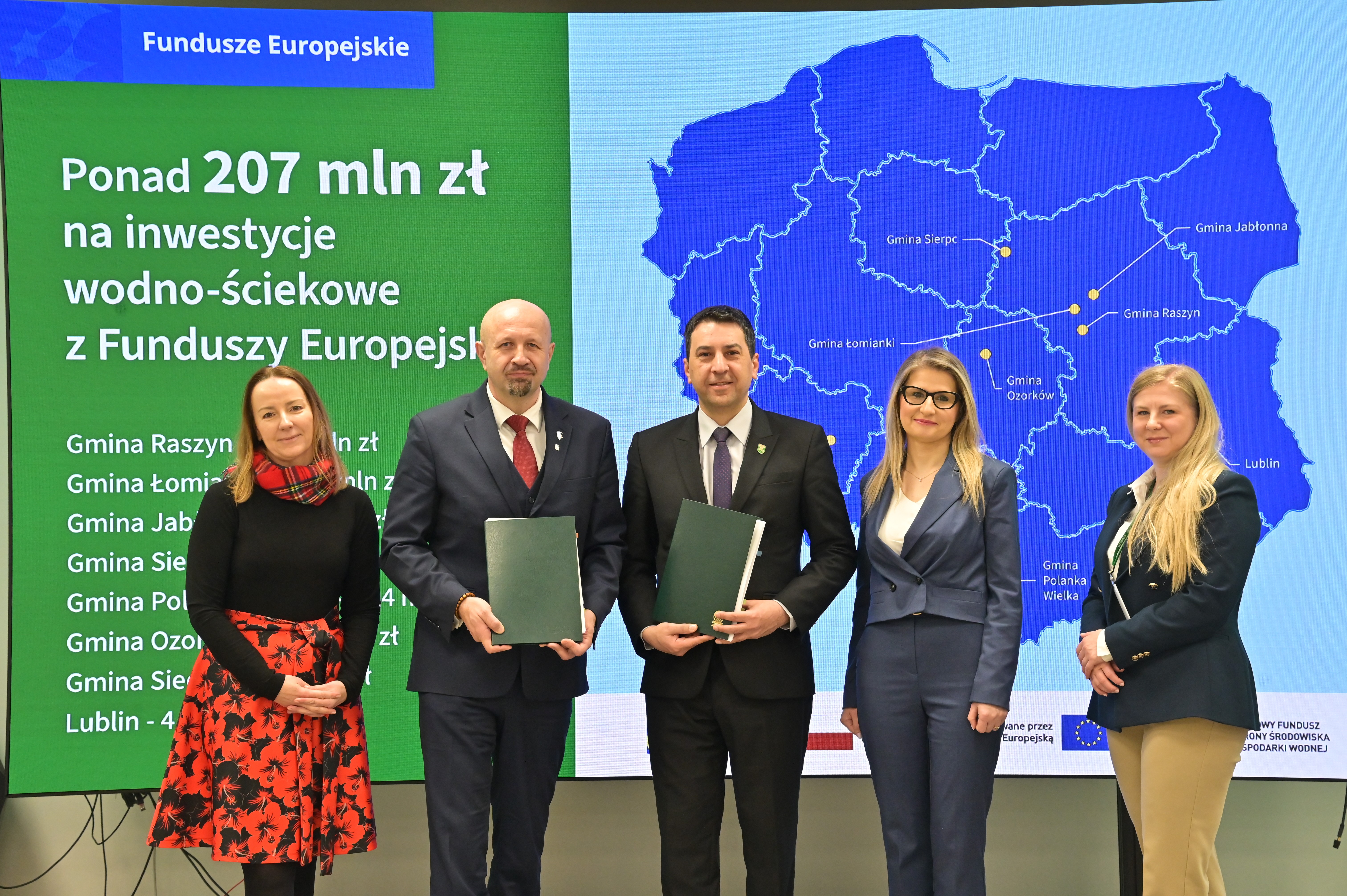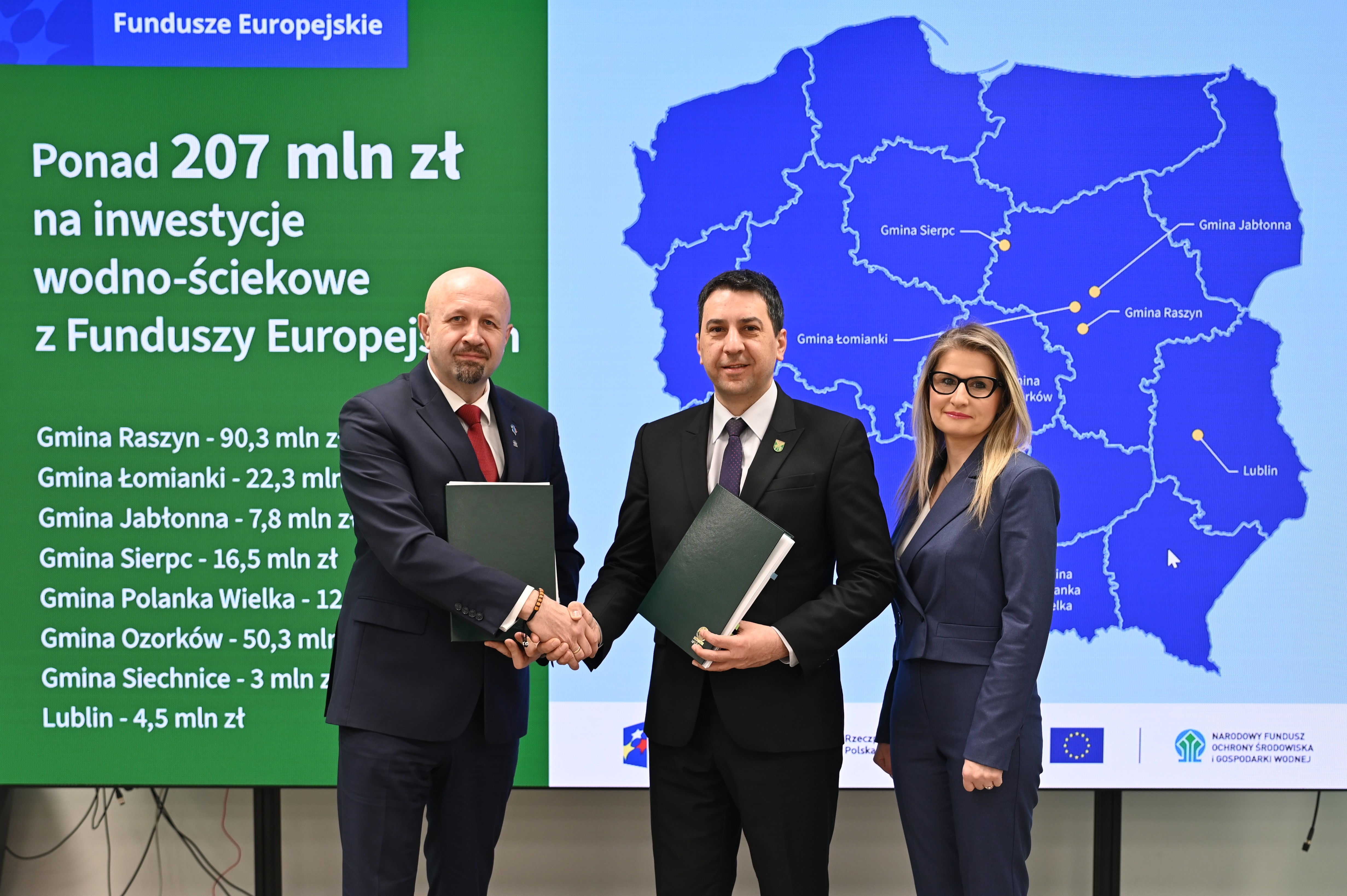 - Umowy podpisali Dorota Zawadzka-Stępniak, prezes zarządu NFOŚiGW, Robert Gajda, zastępca prezesa zarządu NFOŚiGW oraz przedstawiciele beneficjentów: Artur Szymczyk, prezesa zarządu MPWiK Lublin, Sławomir Matyjaszczyk, wiceprezes zarządu MPWiK Lublin; Grzegorz Gałgan, wójt gminy Polanka Wielka, Kamila Mikołajek, skarbnik gminy Polanka Wielka; Paweł Pakieła, dyrektor zarządu spółki MPGK „EMPEGEK” Sierpc; Tomasz Komorowski, prezes zarządu Ozorkowskie Przedsiębiorstwo Komunalne Sp. z o.o., Krzysztof Szaciłowski, wiceprezes zarządu Ozorkowskie Przedsiębiorstwo Komunalne Sp. z o.o.;Leszek Lupa, prezes zarządu Zakładu Gospodarki Komunalnej Sp. z o.o. w Świętej Katarzynie; Jarosław Chodorski, wójt gminy Jabłonna, Joanna Tomaszewska, skarbnik gminy Jabłonna; Sebastian Bodzenta, prezes zarządu ZWiK w Łomiankach, Bożena Cholewa, główna księgowa ZWiK w Łomiankach; Bogumiła Stępińska-Gniadek, wójt gminy Raszyn, Agnieszka Braun, skarbnik gminy Raszyn.