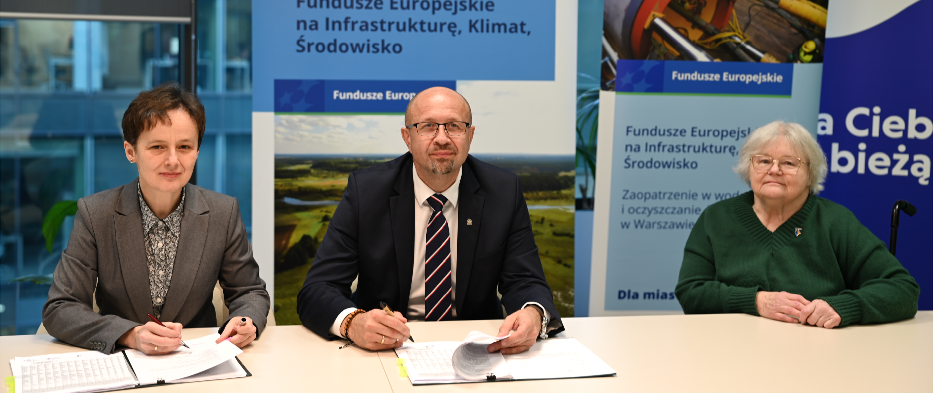 - Umowę o dofinansowanie podpisał Robert Gajda, zastępca prezesa zarządu Narodowego Funduszu Ochrony Środowiska i Gospodarki Wodnej (NFOŚiGW) oraz Renata Tomusiak, prezes zarządu i Justyna Prokopiuk, członek zarządu MPWiK w Warszawie.