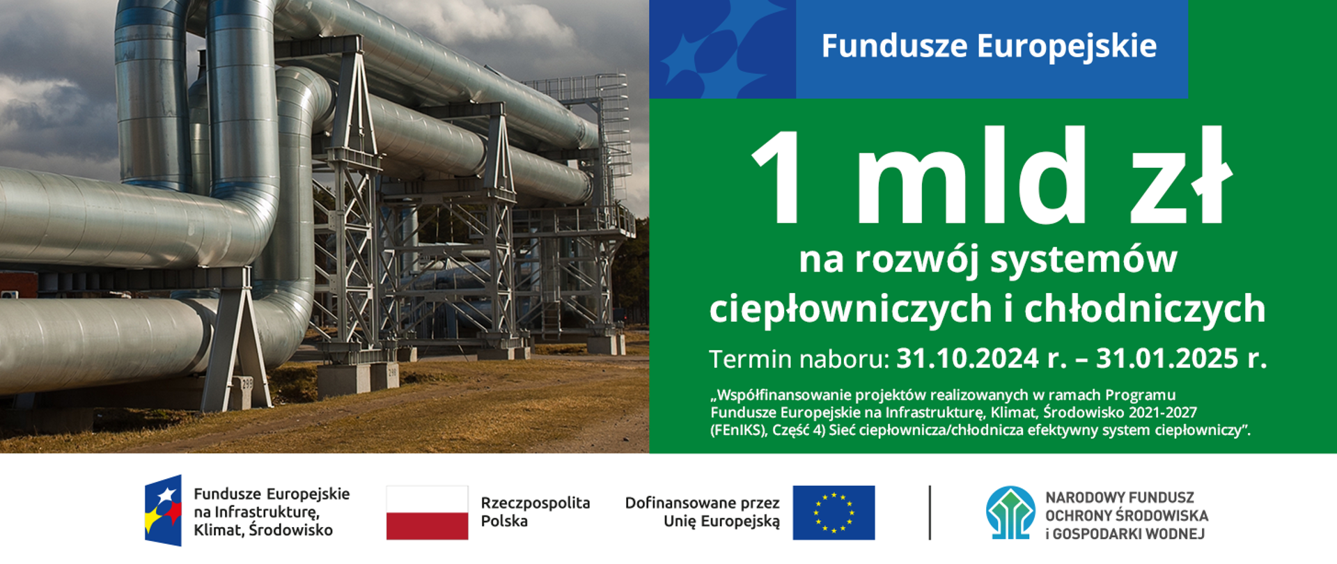 Narodowy Fundusz Ochrony Środowiska i Gospodarki Wodnej (NFOŚiGW) otworzył nabór wniosków na projekty rozwojowe dla efektywnych systemów ciepłowniczych i chłodniczych w ramach programu „Współfinansowanie projektów realizowanych w ramach Programu Fundusze Europejskie na Infrastrukturę, Klimat, Środowisko 2021-2027 (FEnIKS), Część 4) Sieć ciepłownicza/chłodnicza efektywny system ciepłowniczy”. Budżet na dotacje i pożyczki to ponad 1 mld zł.