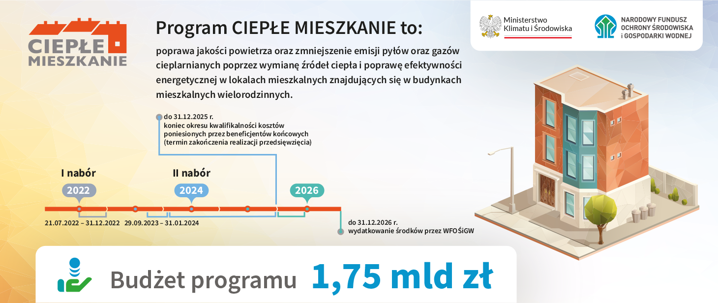„Ciepłe Mieszkanie” to odpowiednik programu „Czyste Powietrze”, kierowanego do właścicieli domów jednorodzinnych. Celem programu „Ciepłe Mieszkanie” jest wsparcie wymiany źródeł ciepła na paliwo stałe i poprawy efektywności energetycznej w lokalach mieszkalnych znajdujących się w budynkach mieszkalnych wielorodzinnych.