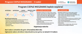 Program „Ciepłe Mieszkanie” składa się z czterech części, pierwsze trzy dedykowane są osobom fizycznym, dla których obowiązują trzy poziomy dofinansowania uzależnione od dochodów oraz ostatnia, czwarta część, dla wspólnot. W drugim naborze kwoty dotacji zwiększono o ok. 10 proc. w stosunku do pierwszej edycji programu. Preferencyjne warunki (dodatkowe 5 proc. intensywności dofinansowania, co przekłada się także na wyższe dofinansowanie) przewidziano dla mieszkańców najbardziej zanieczyszczonych gmin