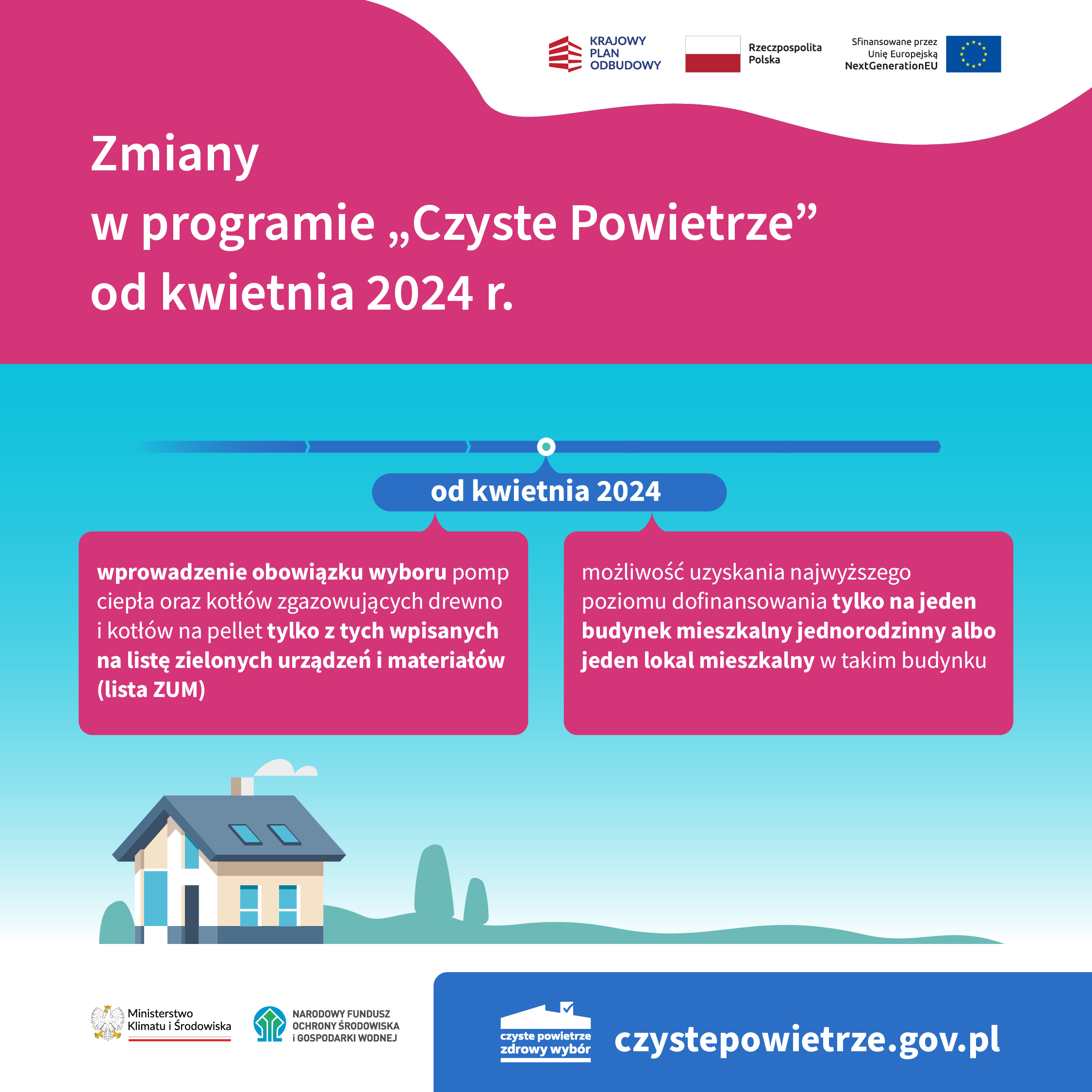 Wprowadzenie obowiązku wyboru pomp ciepła oraz kotłów zgazowujących drewno i kotłów na pellet tylko z tych wpisanych na listę zielonych urządzeń i materiałów (lista ZUM), a także możliwość uzyskania najwyższego poziomu dofinansowania tylko na jeden budynek mieszkalny jednorodzinny albo jeden lokal mieszkalny w takim budynku – to zmiany w „Czystym Powietrzu”, które zaczną obowiązywać od kwietnia 2024 r.