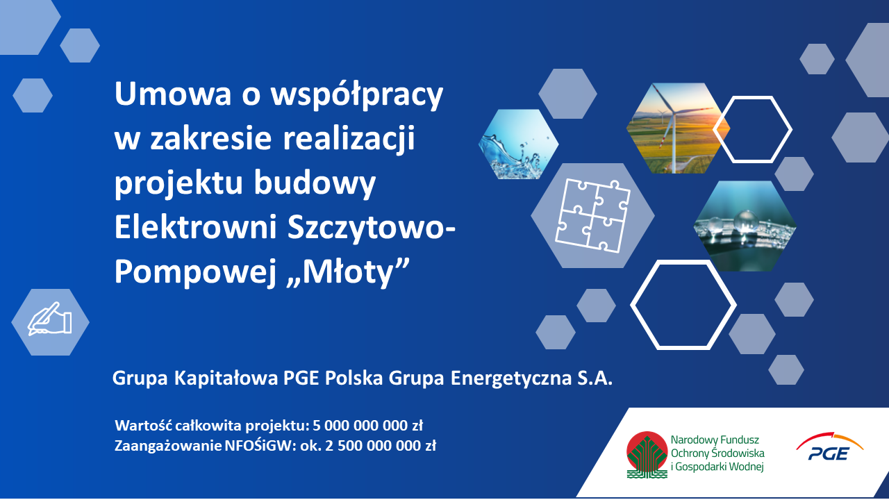 PGE Polska Grupa Energetyczna i Narodowy Fundusz Ochrony Środowiska i Gospodarki Wodnej będą razem współpracować przy projekcie budowy Elektrowni Szczytowo – Pompowej „Młoty”. Realizacja projektu ESP „Młoty” wesprze krajową transformację energetyczną i zapewni w przyszłości stabilność pracy Krajowego Systemu Elektroenergetycznego.