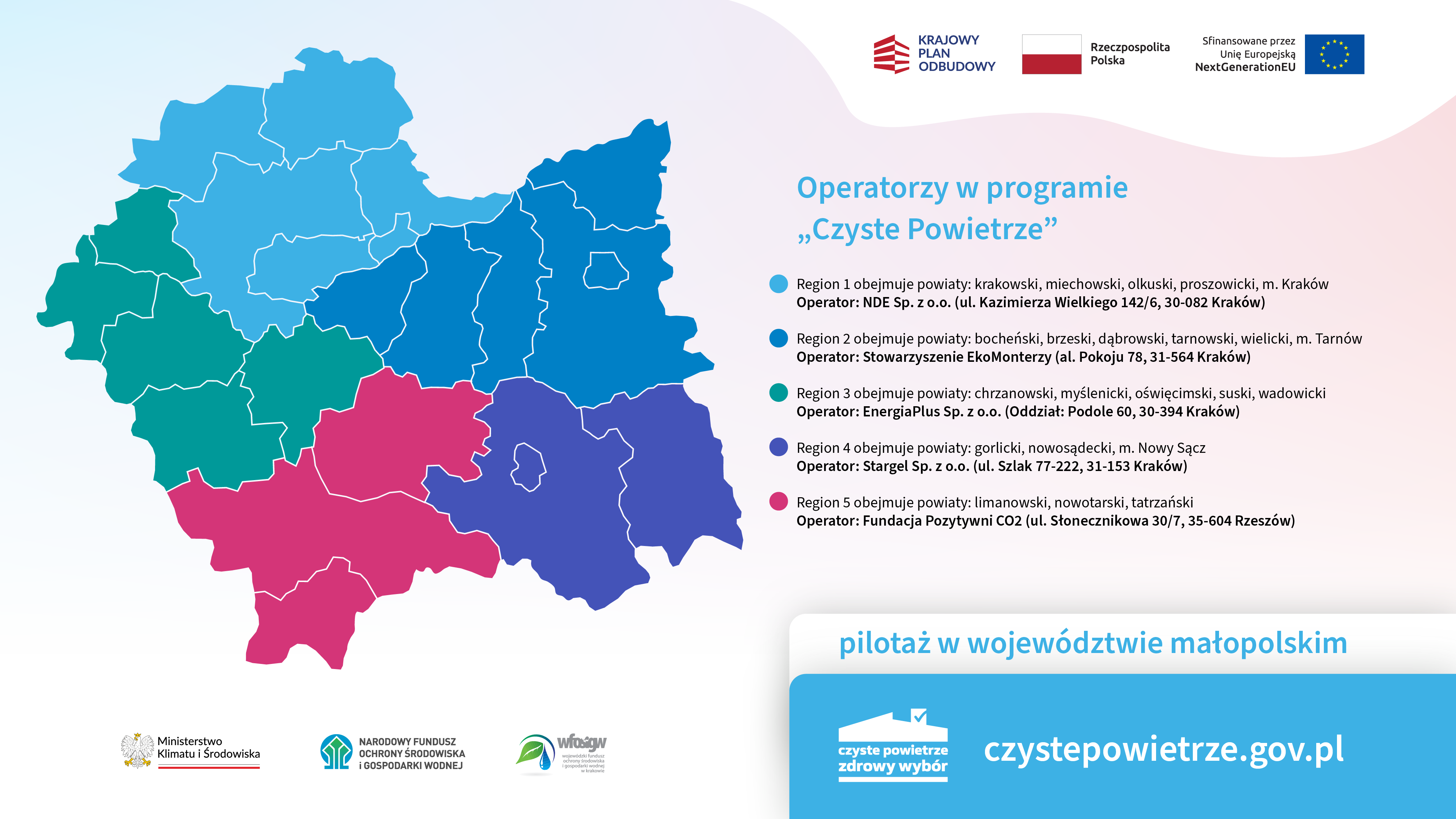 Umowy o dofinansowanie zawarte między NFOŚiGW a pięcioma operatorami wskazują na obszar ich działania w województwie do marca 2026 r. Poszczególne regiony obsługiwać będą: