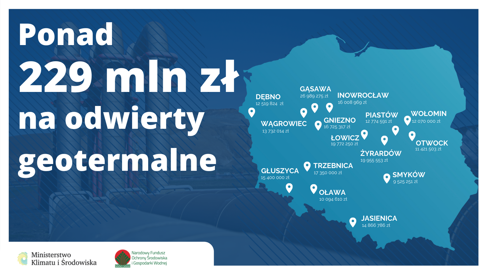 Narodowy Fundusz Ochrony Środowiska i Gospodarki Wodnej sfinansuje kwotą 229,2 mln zł wykonanie otworów geotermalnych w 15 miejscowościach na terenie całego kraju. Celem projektu jest poszukiwanie i rozpoznanie wód termalnych oraz opracowanie dokumentacji hydrogeologicznych dla tych lokalizacji. Przedsięwzięcia te pozwolą zbadać i ocenić zasoby wód termalnych, które mogą stać się lokalnymi zasobami dla produkcji energii cieplnej, a nawet docelowo elektrycznej. Odwierty sfinansowane niemal w 100 proc. przez NFOŚiGW będą wykonane w 8 województwach.