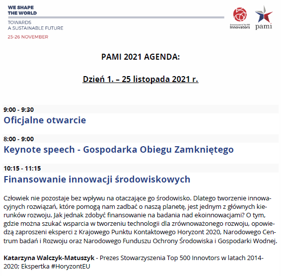 PAMI jest corocznym wydarzeniem dla przedsiębiorców, naukowców i studentów zajmujących się opracowywaniem nowych rozwiązań opartych na unikalnej wiedzy i zaawansowanych technologiach, organizowane przez Stowarzyszenie Top 500 Innovators. Tegoroczna edycja PAMI, będzie koncentrować się na zmianach klimatu i odnawialnych źródłach energii, a także na tworzeniu miejsc pracy opartych na czystej energii i ochronie środowiska.