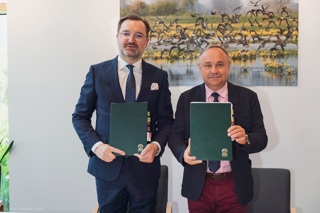 Umowa o dofinansowanie przedsięwzięcia została podpisana 26 maja br. na Wydziale Biologii Uniwersytetu w Białymstoku przez wiceprezesa zarządu NFOŚiGW Sławomira Mazurka oraz dra hab. Jarosława Matwiejuka, prof. Uniwersytetu w Białymstoku, prorektora ds. rozwoju.