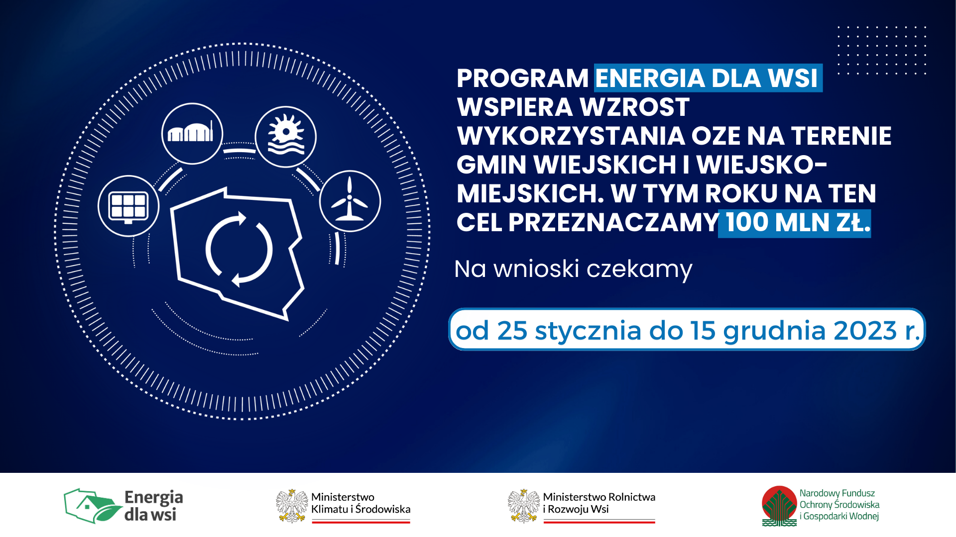 Nabór wniosków w ramach programu „Energia dla wsi” ma się odbywać, w trybie ciągłym od 25 stycznia do 15 grudnia 2023 r. lub do wyczerpania przewidzianej puli środków. Wnioski o pożyczki i dotacje będzie można składać tylko w wersji elektronicznej poprzez Generator Wniosków o Dofinansowanie (GWD). https://gwd.nfosigw.gov.pl/.