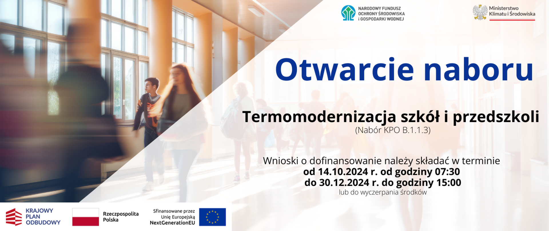 Narodowy Fundusz Ochrony Środowiska i Gospodarki Wodnej (NFOŚiGW) rozpoczął dziś nabór wniosków w nowym programie "Wymiana źródeł ciepła i poprawa efektywności energetycznej szkół”. Wnioski będą przyjmowane od 14.10.2024 r. do 30.12.2024 r. lub do wyczerpania środków.