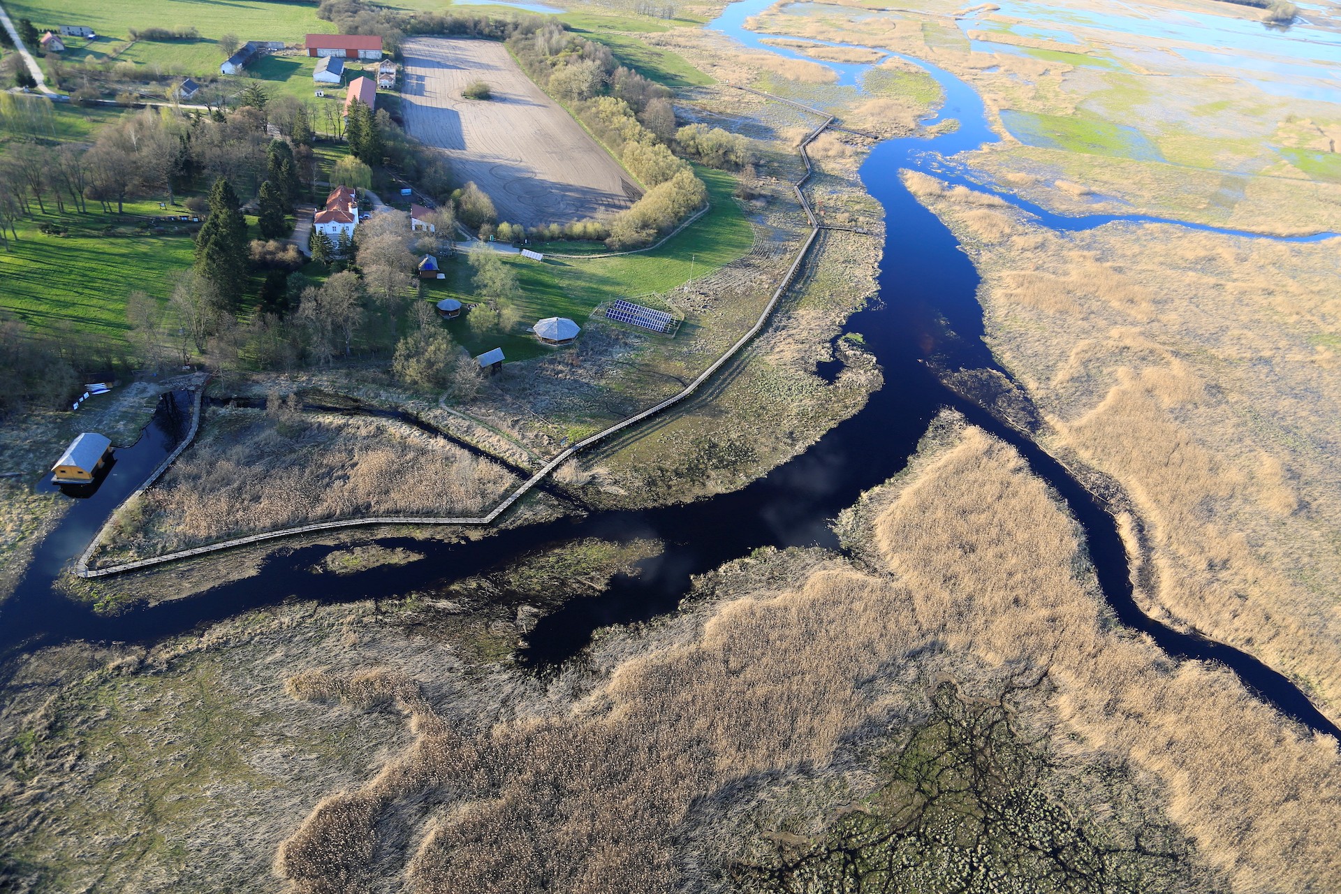 Kładka wśród bagien tworzy pętlę o długości ok. 1 km, która pozwala na prowadzenie zajęć terenowych i edukacyjny spacer. Inspiracją dla jej przebiegu i kształtu są meandry i zakola rzeki. Ścieżka będzie wykonana m.in. z kompozytu z recyklingu, imitującego drewno. Będzie dostępna dla osób z niepełnosprawnościami – jej wejścia i zejścia będą miały łagodne nachylenie, na platformy widokowe będzie można wjechać wózkiem. Dla osób niedowidzących zostanie przygotowany plan tyflograficzny i odpowiednie oznakowania ważniejszych elementów infrastruktury. Dodatkowo kładka będzie wyposażona w tablice informacyjne, kamerę do transmisji on-line, lunety ornitologiczne na wieży widokowej i platformie.