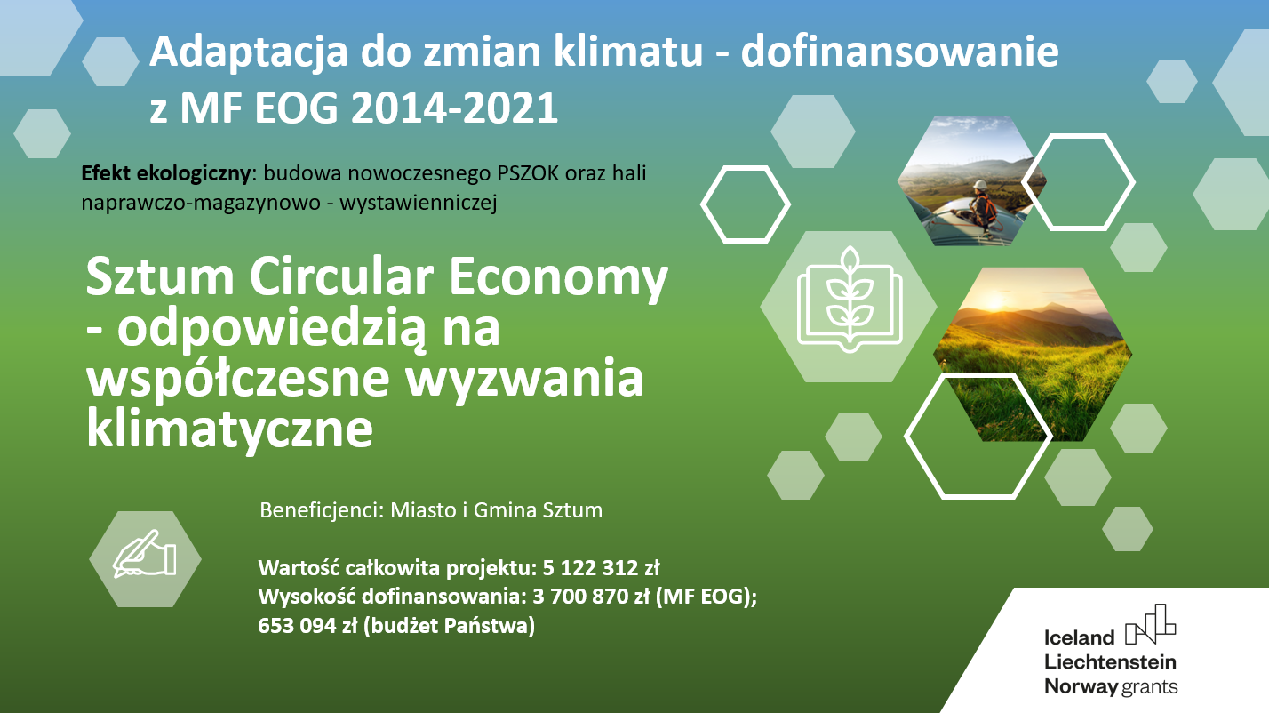 Projekt pn. „Sztum Circular Economy - odpowiedzią na współczesne wyzwania klimatyczne” otrzymał dofinansowanie z NFOŚiGW, z Mechanizmu Finansowego Europejskiego Obszaru Gospodarczego (MF EOG), w ramach programu Środowisko, Energia i Zmiany Klimatu. Inwestycja zostanie wdrożona przez Miasto i Gminę Sztum przy współpracy z partnerem norweskim - International Development Norway oraz z partnerami krajowymi - Stowarzyszeniem Gmin Rzeczypospolitej Polskiej Euroregion Bałtyk oraz Politechniką Gdańską.
