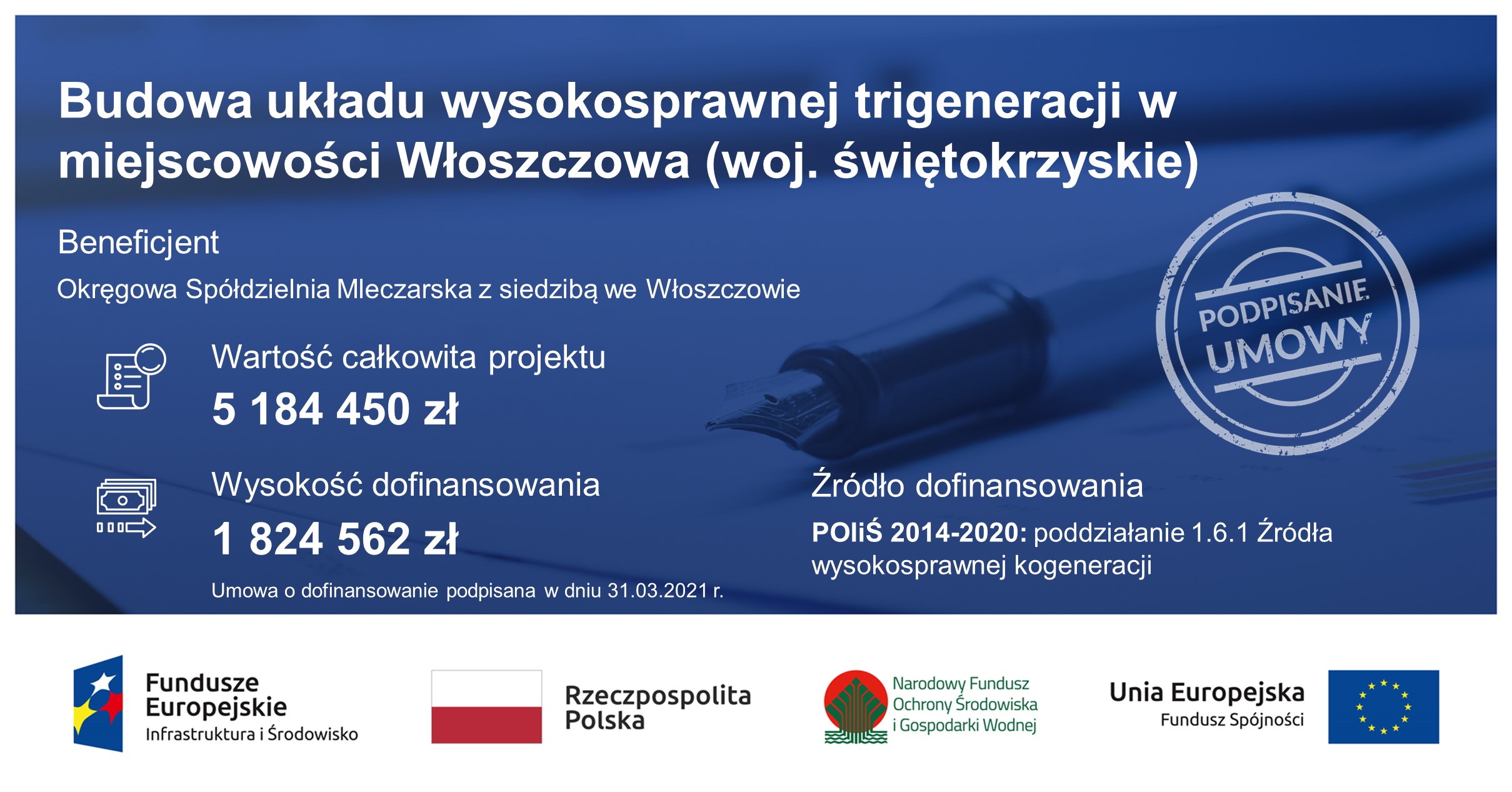 Okręgowa Spółdzielnia Mleczarska Włoszczowa dzięki dotacji z Funduszu Spójności wybuduje instalację wysokosprawnej trigeneracji, która wyprodukuje energię elektryczną, ciepło oraz chłód użytkowy. Całkowity koszt projektu to ok. 5,2 mln zł.