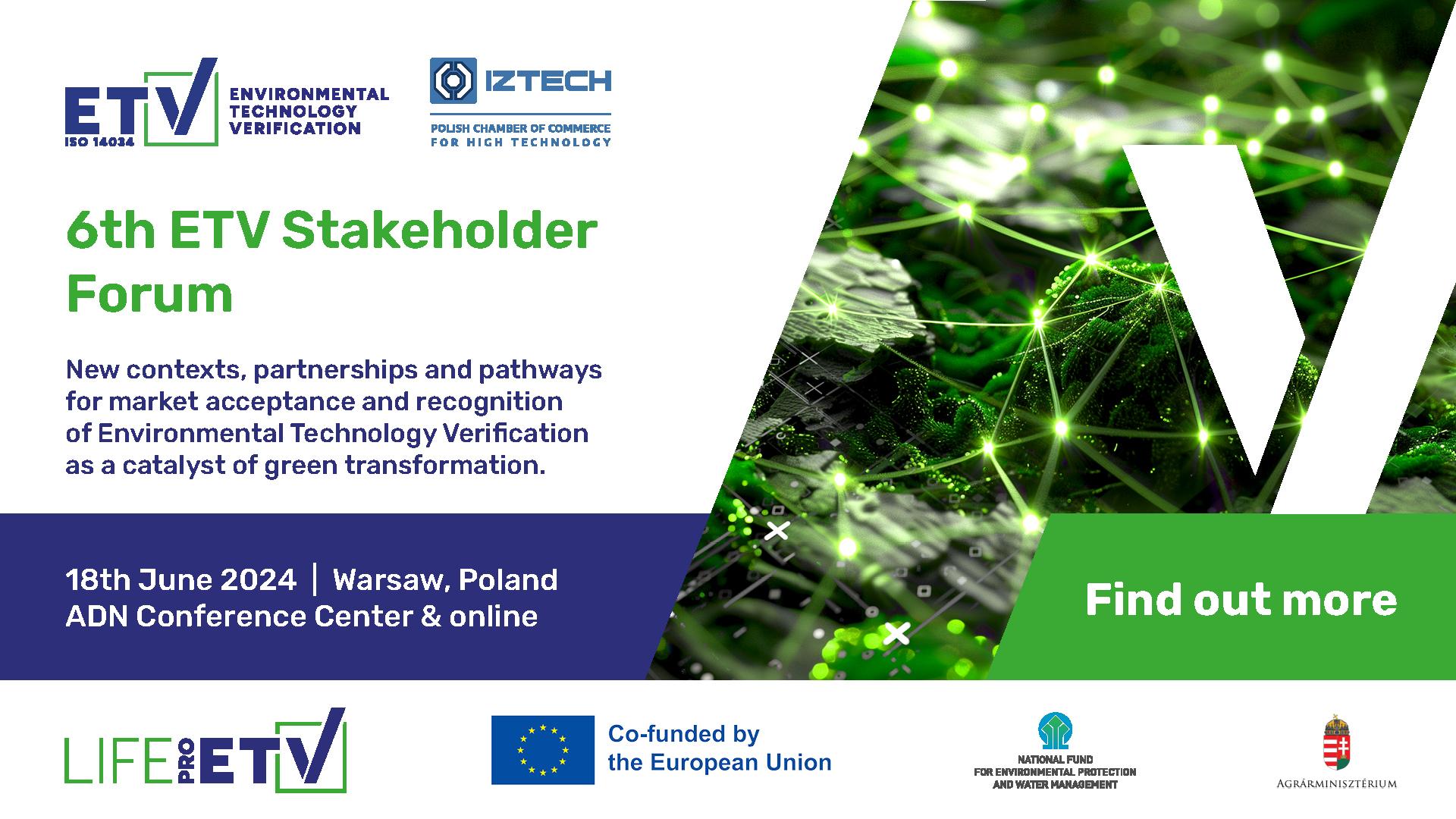 Najbliższe wydarzenie odbędzie się we wtorek, 18 czerwca 2024 r. w Centrum Konferencyjnym ADN w Warszawie i jest już szóstą edycją z całego cyklu przedsięwzięć poświęconych ETV, podczas których prowadzone są dyskusje na temat komercjalizacji innowacyjnych technologii środowiskowych, ograniczania ryzyka inwestycji w zielone technologie oraz możliwości współpracy w zakresie wykorzystania systemu weryfikacji do realizacji celów zielonej transformacji, jak i budowania konkurencyjnej pozycji Europy na rynku globalnym. VI Forum ETV jest również wydarzeniem kończącym realizację projektu LIFEproETV.
