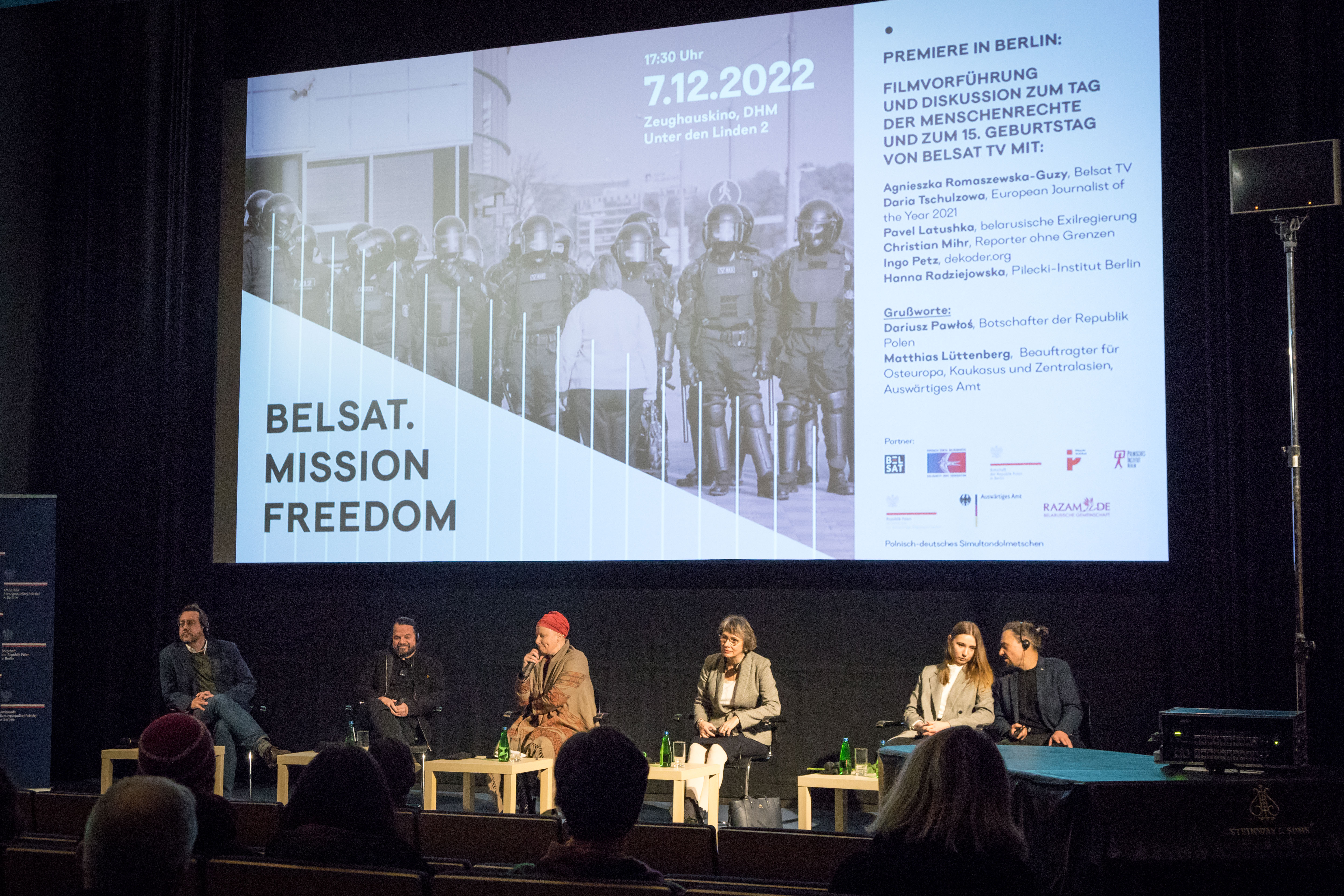 7 grudnia br. we współpracy z Telewizją Biełsat, Fundacją Strefa Solidarności, Instytutem Pileckiego i Instytutem Polskim, stowarzyszeniem Białorusinów w Niemczech RAZAM i Federalnym Urzędem Spraw Zagranicznych – Ambasada RP w Berlinie zorganizowała wydarzenie z okazji 15-lecia Telewizji Biełsat. W sali kinowej przy Unter den Linden 2 (Zeughauskino, Deutsches Historisches Museum) przypomnieliśmy o losie białoruskich dziennikarzy w związku z Międzynarodowym Dniem Walki z Bezkarnością za Przestępstwa wobec Dziennikarzy i Międzynarodowym Dniem Praw Człowieka. Wspomnieliśmy także Białoruskie Stowarzyszenie Dziennikarzy, które w 2022 roku otrzymało Międzynarodową Nagrodę Wolności Prasy UNESCO im. Guillermo Cano.