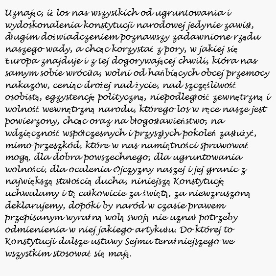 Konstytucja przyjęta przez Sejm Rzeczypospolitej (nazwany później Wielkim) w dniu 3 maja 1791 roku w Warszawie była pierwszą w Europie i drugą w świecie nowoczesną konstytucją.
