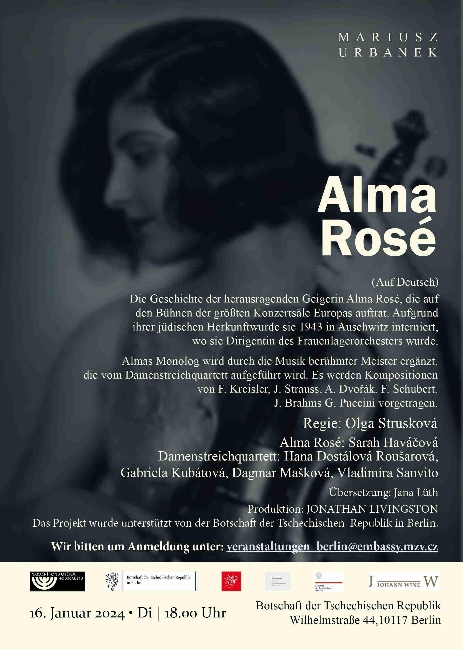 Sztuka opowiadająca historię niezwykłej skrzypaczki Almy Rosé pokazana zostanie 16 stycznia br. w Ambasadzie Republiki Czeskiej w Berlinie.