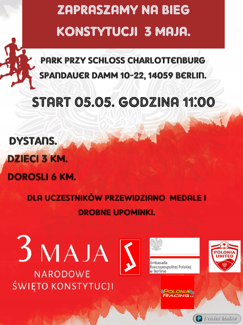 Z okazji Święta Narodowego Rzeczypospolitej Polskiej, zapraszamy we współpracy ze Związkiem Polaków w Niemczech spod znaku Rodła, Młodzieżową Reprezentacją Berlina "Polonia United" oraz Polonia Racing do udziału w Biegu Konstytucji uchwalonej 3 maja 1791 roku.