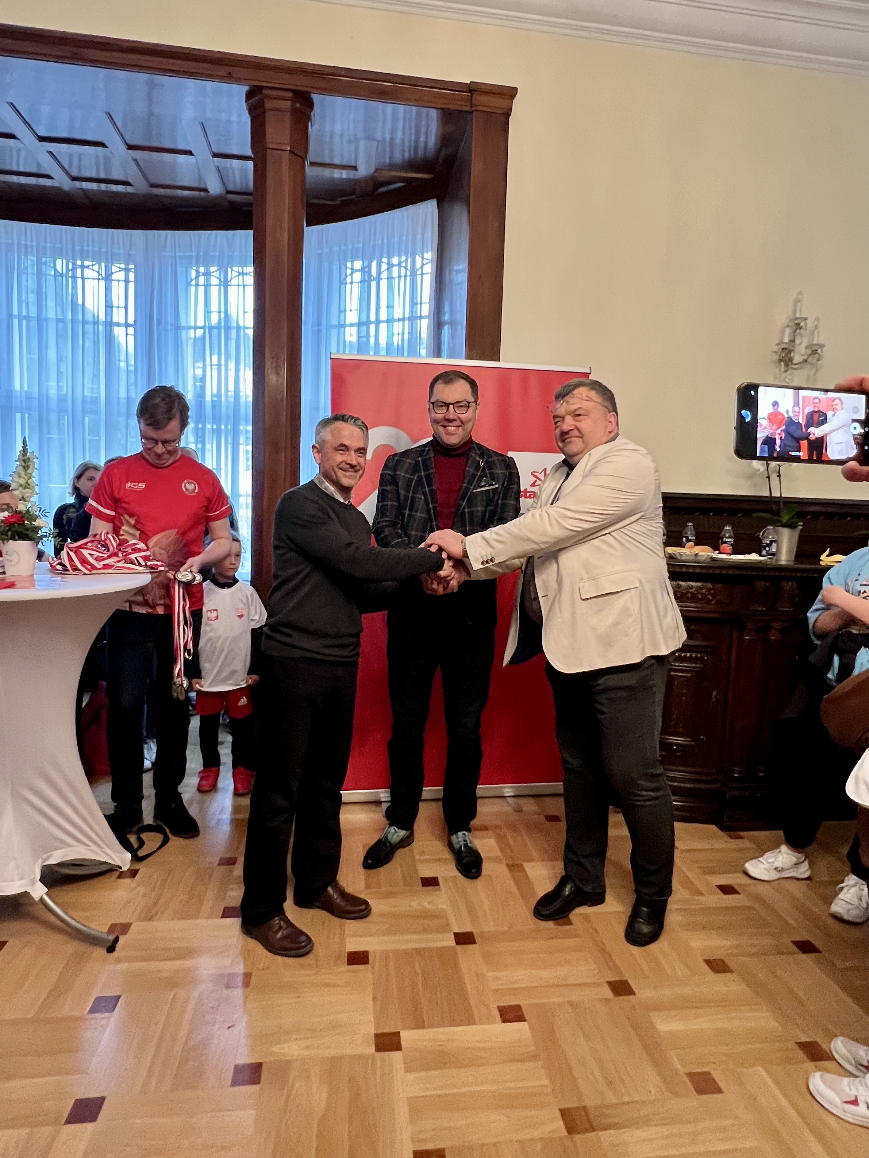W budynku ambasady dla sportowców i zaproszonych gości przygotowano poczęstunek, złożony z potraw trzech krajów. 100 pamiątkowych medali z napisem w języku niemieckim „Polska-Litwa-Ukraina / 232. rocznica Konstytucji z 3.05.1791 – Bieg Przyjaźni” wręczyli uczestnikom biegu ambasadorowie RP Dariusz Pawłoś, Litwy Ramunas Misilius i Ukrainy Oleksij Makeiev. Najmłodsi uczestnicy biegu otrzymali dodatkowo gadżety przygotowane przez biuro POT.