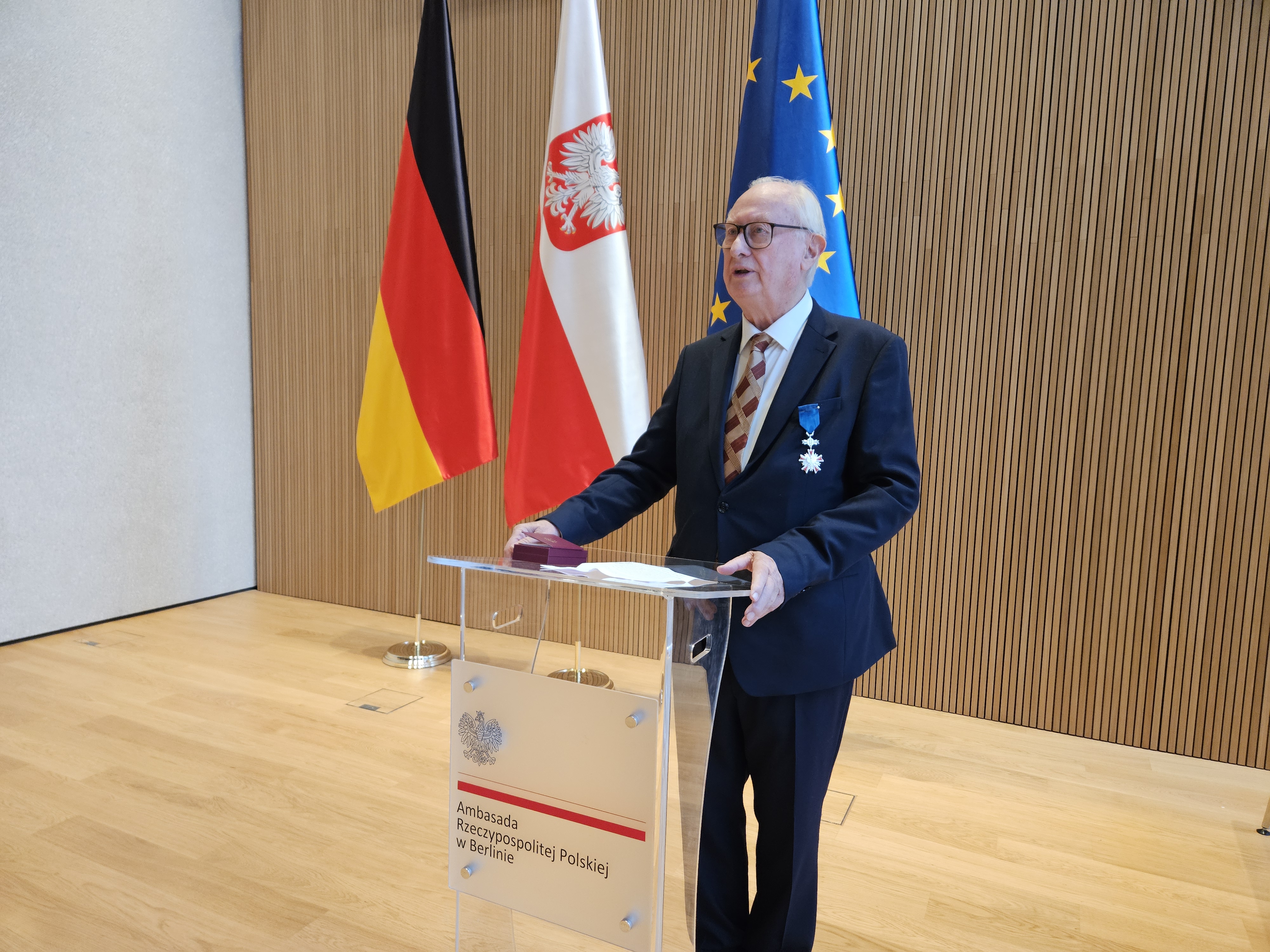 „Zbudował Pan mosty: między przeszłością a przyszłością, między Niemcami a Polską, między pamięcią a nadzieją” – powiedział Jan Tombiński podczas ceremonii wręczenia odznaczenia.