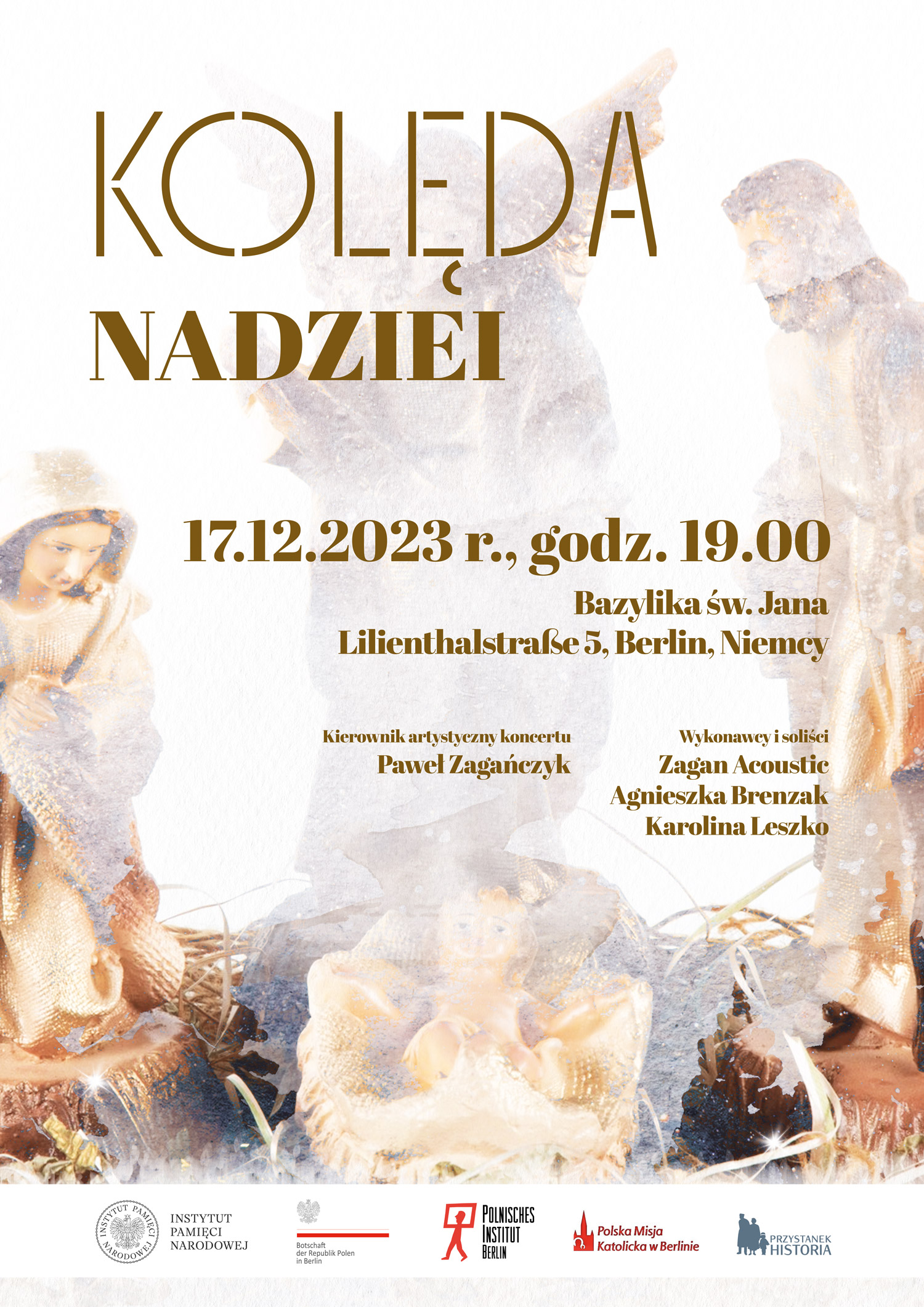 Instytut Pamięci Narodowej zaprasza na wyjątkowy koncert "Kolęda Nadziei", podczas którego obok popularnych kolęd i pastorałek wykonane zostaną również kolędy obozowe i okupacyjne (np. Kolęda Katyńska czy Kolęda warszawskich powstańców do kompozycji Krzysztofa Falkowskiego).