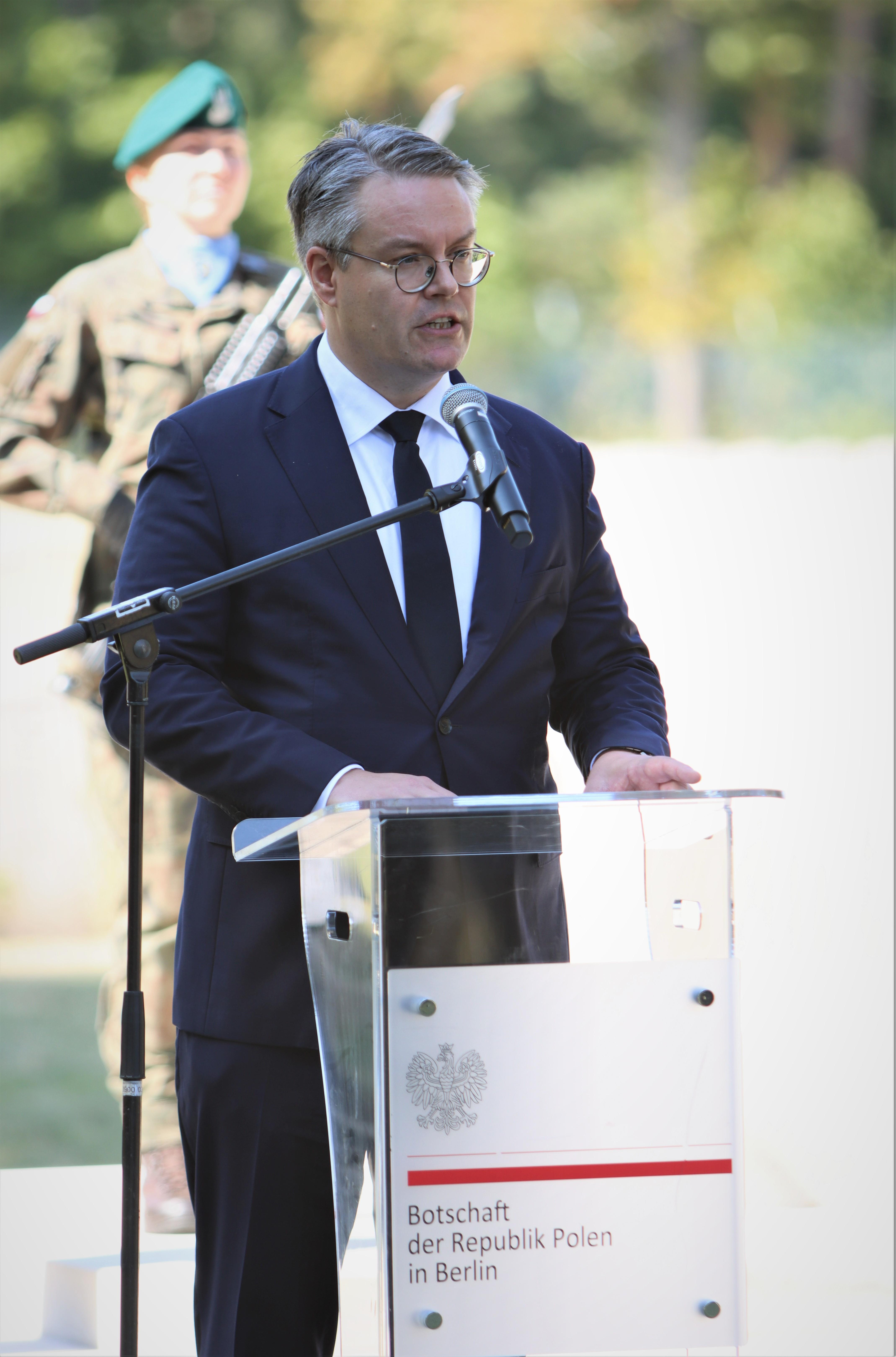 Kierujący Ambasadą J. Tombiński nawiązał do tragedii II wojny światowej i lekcji, jaką powinniśmy z niej wyciągnąć. Przestrzegł przed stosowaniem mowy nienawiści w przestrzeni publicznej. Odniósł się również do agresji Rosji na Ukrainę i trwającej od 2022 r. w jej efekcie wojny. Przypomniał, że idea upamiętnienia polskich ofiar w Berlinie wyszła od prof. W. Bartoszewskiego. Jej realizacja trwa zbyt długo, gdy tymczasem kolejni świadkowie historii, w tym prof. Bartoszewski, odchodzą. Ambasador podkreślił konieczność pielęgnowania pamięci o tragicznych wydarzeniach nie tylko przez potomków ofiar, ale również sprawców.