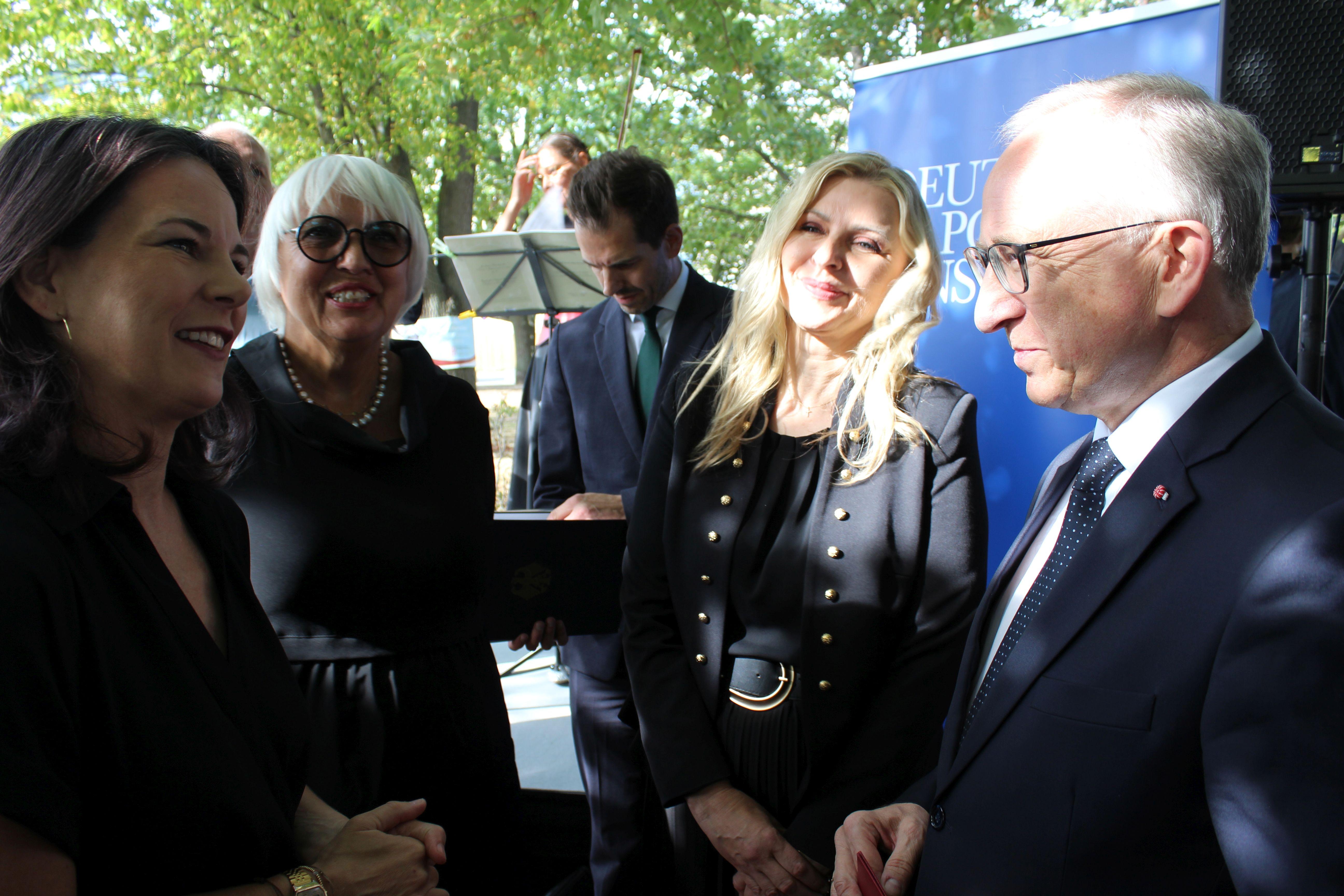 W swoim wystąpieniu min. spraw zagranicznych A. Baerbock nawiązała do dwóch symboli w relacjach polsko-niemieckich – postaci W. Bartoszewskiego i mostu na Odrze, łączącego Słubice i Frankfurt nad Odrą. Przypomniała, że W. Bartoszewski przeżył więzienie w Auschwitz, brał udział w Powstaniu Warszawskim i po 1990 r. miał ogromny wkład w polsko-niemieckie pojednanie. Przytoczyła też jego słowa, aby Polacy i Niemcy z wrogów stali się sąsiadami. Po 20 latach od przyjęcia Polski do UE marzenie W. Bartoszewskiego stało się rzeczywistością i dzisiaj jesteśmy „sąsiadami i przyjaciółmi”, którzy razem bronią Europy, w tym Ukrainy. Dowodem owocnej współpracy jest partnerstwo Frankfurtu nad Odrą i Słubic, gdzie w szkołach uczy się j. polskiego i niemieckiego, organizowane są wspólne działania policji, a tysiące osób przekraczają codziennie granicę w obu kierunkach. Min. Baerbock podkreśliła znaczenie wspólnej przeszłości, w szczególności w Berlinie, gdzie zaczęły się niemieckie zbrodnie okresu IIWŚ. Dlatego „czego chcemy i nad czym pracujemy to jest trwały i widoczny pomnik”, przypominający o cierpieniu polskich ofiar niemieckiej okupacji. Min. Baerbock zapewniła, że pomnik powstanie w centrum Berlina.