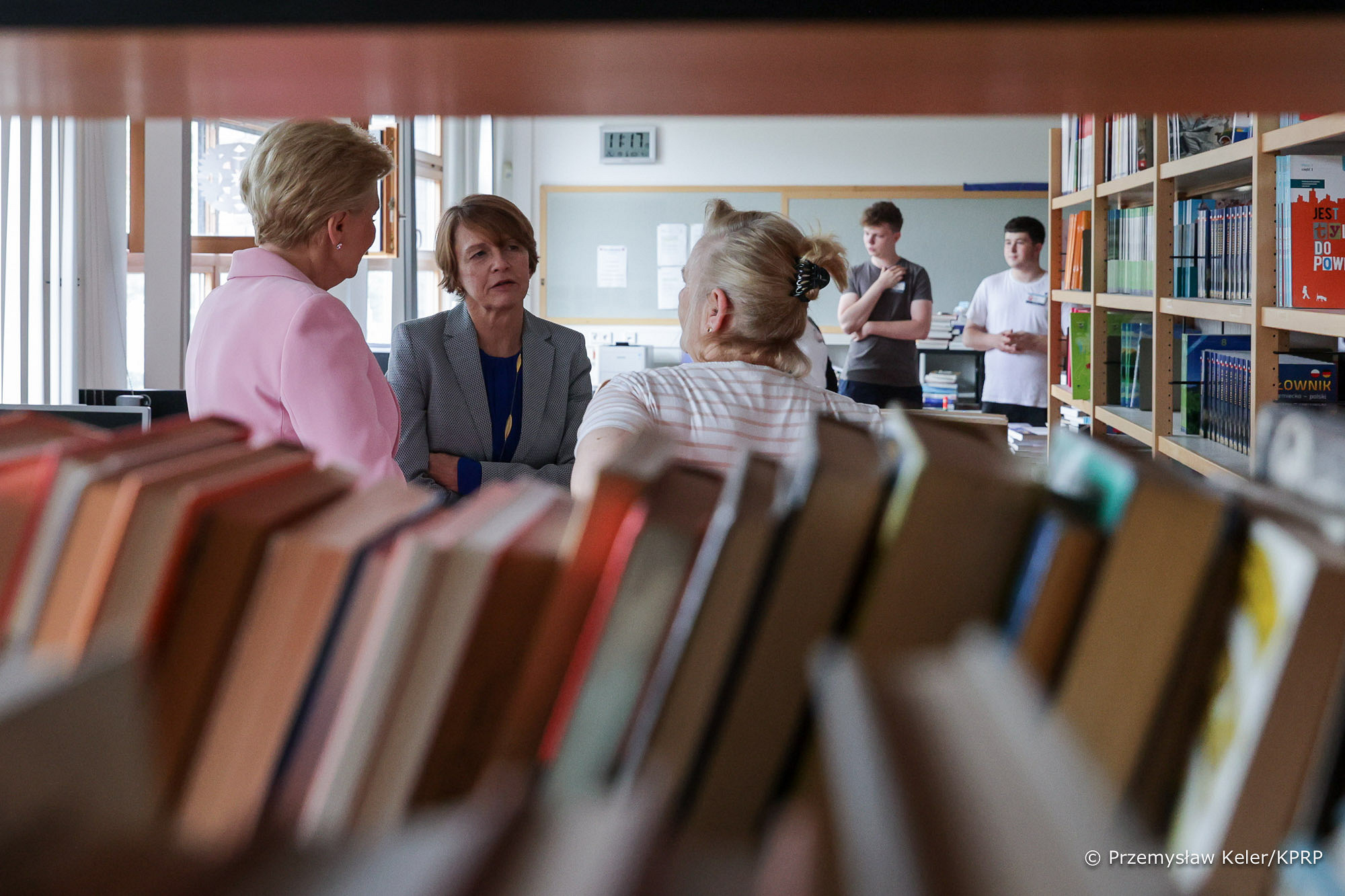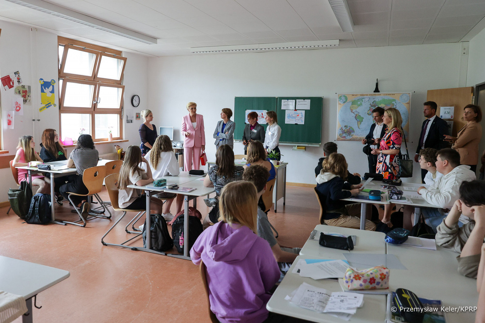 Małżonki Prezydentów Polski i Niemiec obejrzały sale dydaktyczne czy studio dźwiękowe i reżyserkę wykorzystywane podczas warsztatów filmowych, a z przebiegiem zajęć zapoznały się w trakcie dwujęzycznej lekcji geografii. Uczniowie ósmej klasy podjęli pracę nad drganiami skorupy ziemskiej na przykładzie trzęsień ziemi w Turcji i Syrii. Agata Kornhauser–Duda wyraziła podziw dla zdolności językowych nastolatków, którzy bez trudu porozumiewali się jednocześnie po polsku i niemiecku. Pierwsze Damy pytały uczniów o ich plany dotyczące dalszej edukacji, a polska Prezydentowa zaprosiła młodych ludzi do odwiedzenia naszego kraju i Pałacu Prezydenckiego.