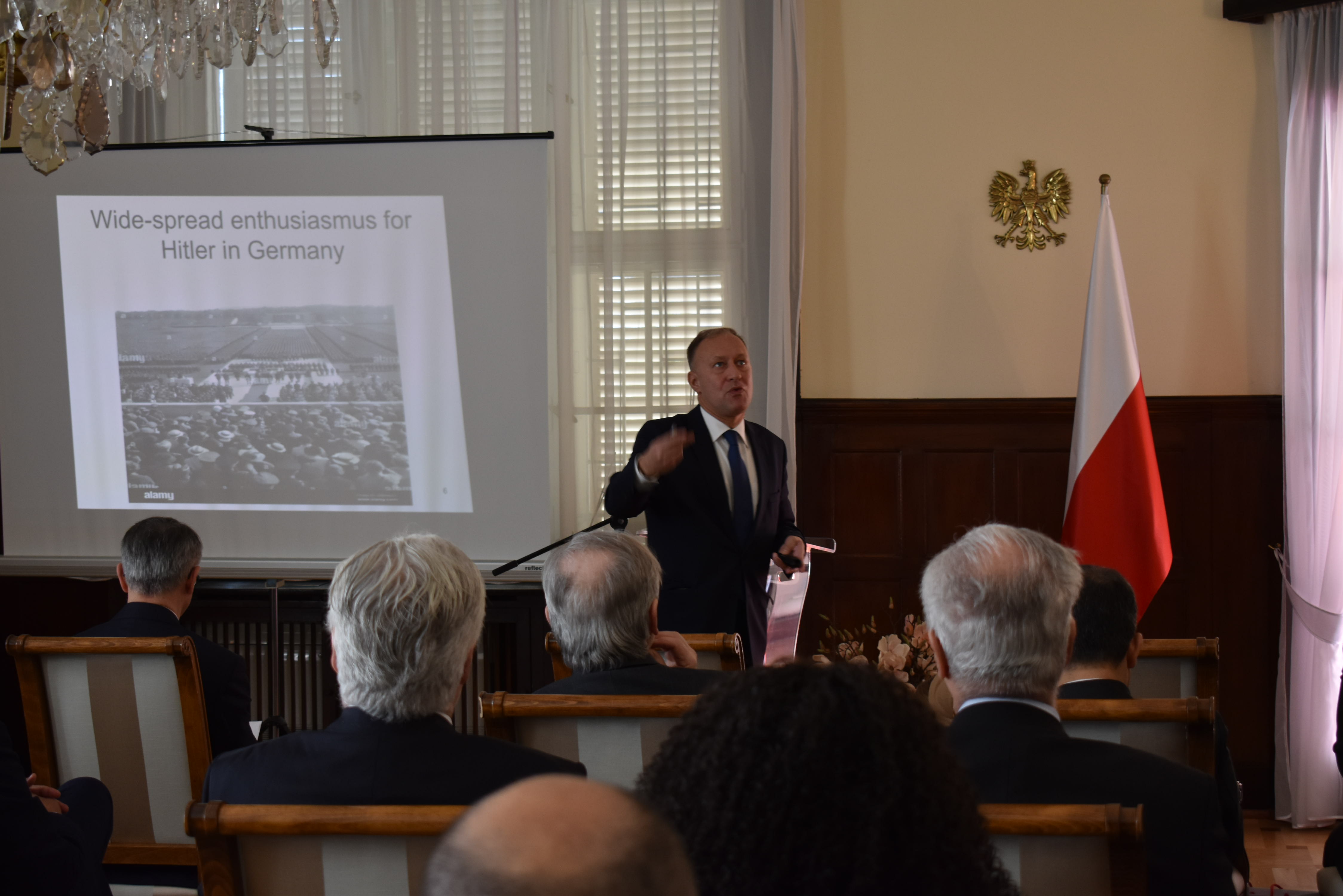 Po słowie wstępnym Ambasadora RP Dariusza Pawłosia prezentacje wygłosili dr Jacek Rosa - Naczelnik Referatu ds. Odszkodowań w Departamencie Polityki Europejskiej Ministerstwa Spraw Zagranicznych RP oraz dr Paweł Pońsko – ekonomista ze Szkoły Głównej Handlowej i członek Rady Instytutu Strat Wojennych im. Jana Karskiego w Warszawie, zarazem współautor "Raportu o stratach poniesionych przez Polskę w wyniku agresji i okupacji niemieckiej w czasie II wojny światowej, 1939-1945".