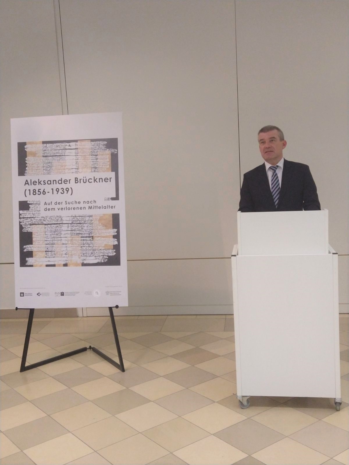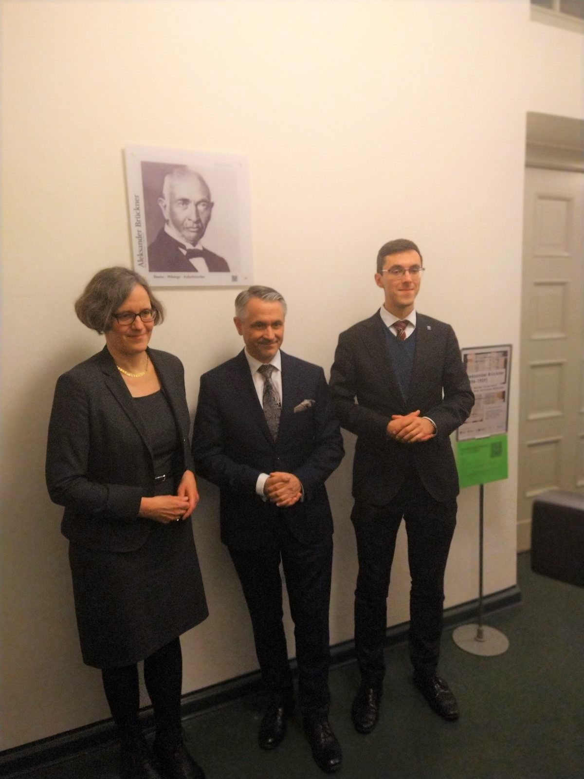 Równolegle na berlińskim Uniwersytecie została zainaugurowana wystawa „Aleksander Brückner. Auf der Suche nach dem verlorenen Mittelalter” opowiadająca o wszechstronnym dorobku naukowym polskiego profesora, który był związany z tą uczelnią w latach 1881-1924 jako kierownik katedry slawistyki. Najważniejsze elementy jego biografii wspólnie przedstawili: prof. Igor Kąkolewski – dyr. Centrum Badań Historycznych Polskiej Akademii Nauk w Berlinie oraz prof. Roland Meyer – dyr. Instytutu Slawistyki i Hungarologii Uniwersytetu Humboldtów. Ważnymi uczestnikami wydarzenia była grupa polonijna, z p. Ewą Marią Slaską na czele, która przez szereg lat dbała o pamięć o badaczu, m. in. pielęgnując jego grób na Tempelhofer Parkfriedhof. Wystawę będzie można oglądać do 5 stycznia 2024 r.